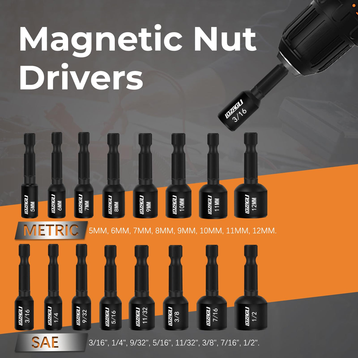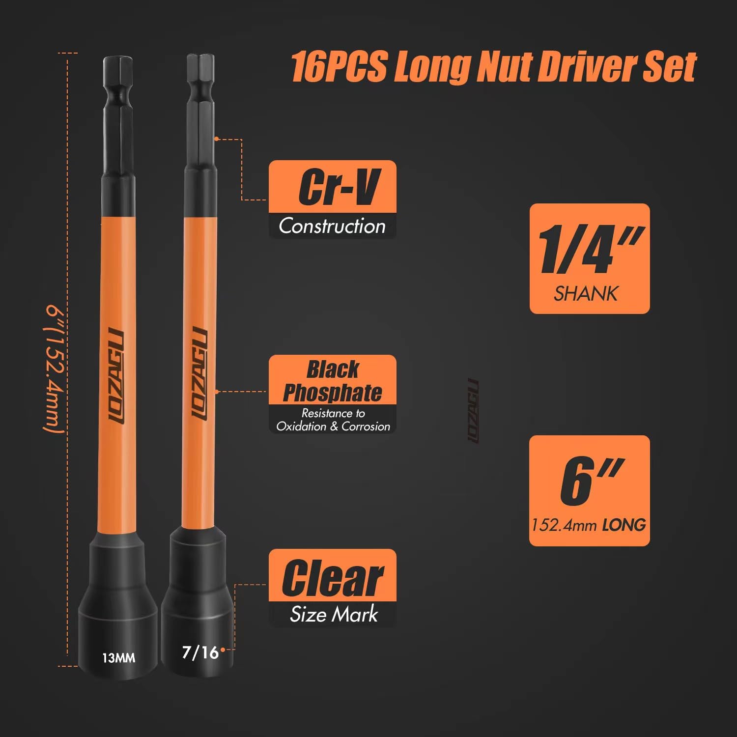 16Pcs Long Magnetic Nut Driver Set for Impact Drill | 6 Inch Long Nut Driver Set | SAE and Metric | 1/4 Inch Hex Shank | Cr-V Steel (16PCS Magnetic Nut Driver (Long))