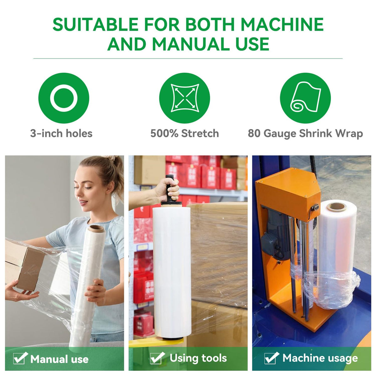- [Ideal for Machine or Hand Use] - The Apexatype industrial-strength shrink wrap roll offers up to 500% stretchability. This 18" wide, 80-gauge shrink wrap with a 3" smooth core is perfect for wrapping tools, furniture, or packages, whether you're using a machine or wrapping by hand. Strong and durable, it won't easily tear or break.