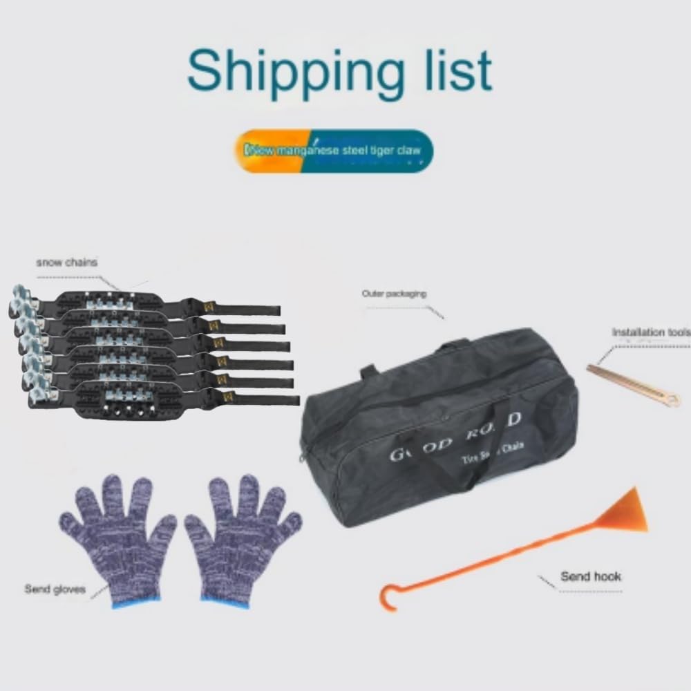 - 【𝐀𝐥𝐥-𝐢𝐧-𝐎𝐧𝐞 𝐊𝐢𝐭】Package includes 6 tire chains, gloves, a long hook with snow shovel, and a portable storage bag.