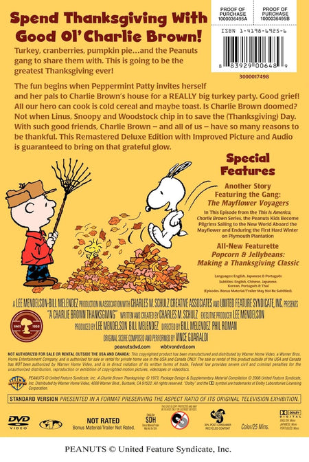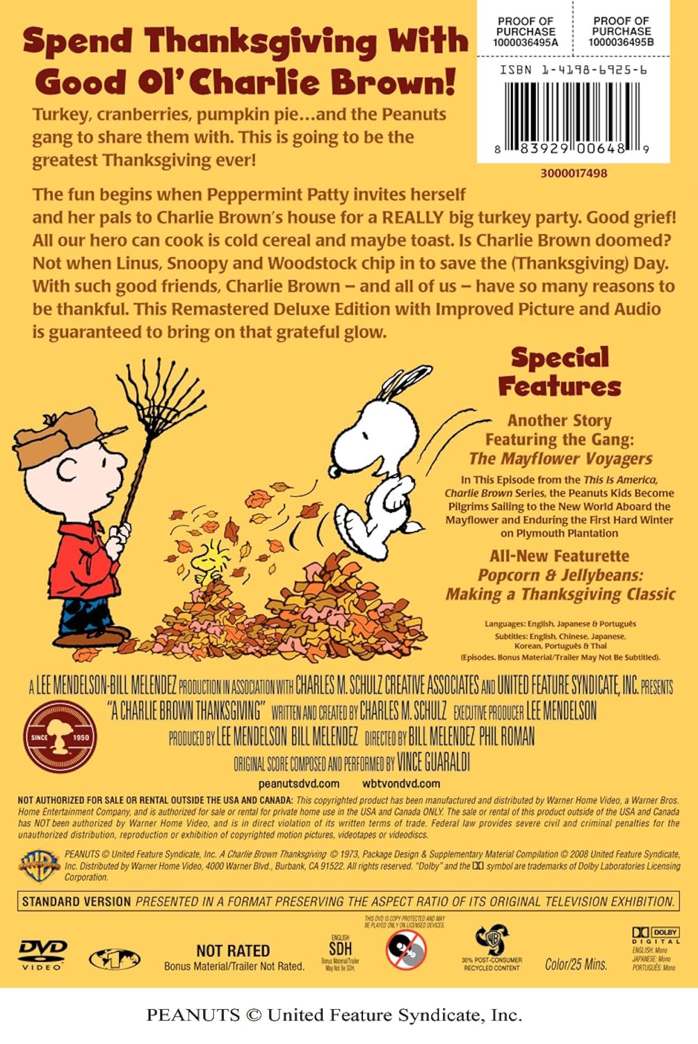 A Charlie Brown Thanksgiving Deluxe Edition (DVD) Turkey, cranberries, pumpkin pie…and the Peanuts gang to share them with. This is going to be the greatest Thanksgiving ever! The fun begins when Peppermint Patty invites herself and her pals to Charlie Brown’s house for a REALLY big turkey party. Good grief! All our hero can cook is cold cereal and maybe toast. Is Charlie Brown doomed? Not when Linus, Snoopy and Woodstock chip in to save the (Thanksgiving) Day. With such good friends, Charlie Brown – and all of us – has so many reasons to be thankful. This Remastered Deluxe Edition with Improved Picture and Audio is guaranteed to bring on that grateful glow.