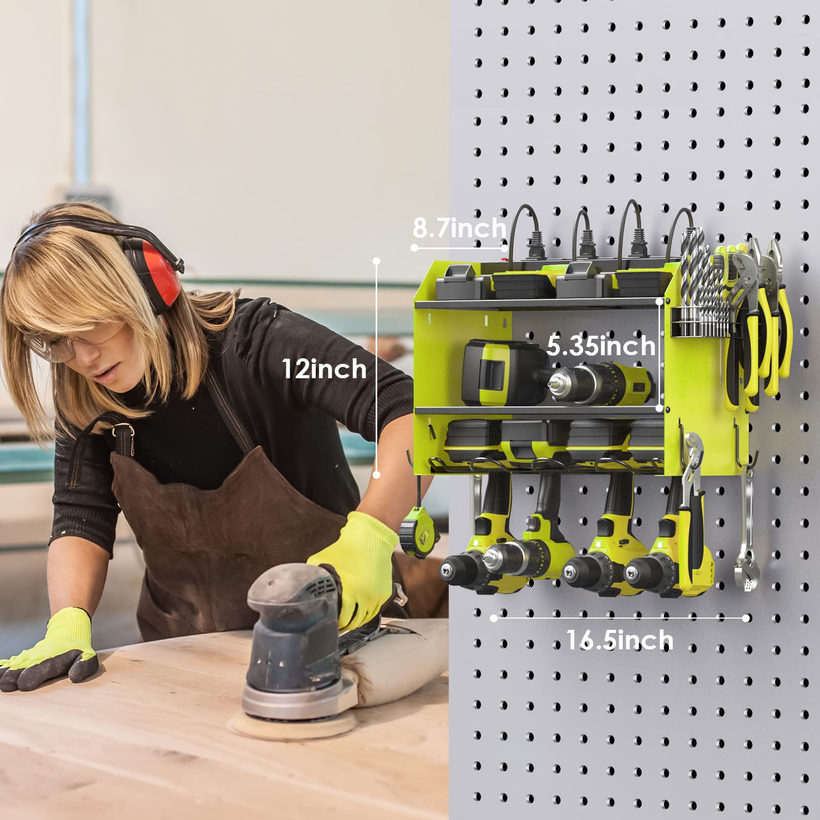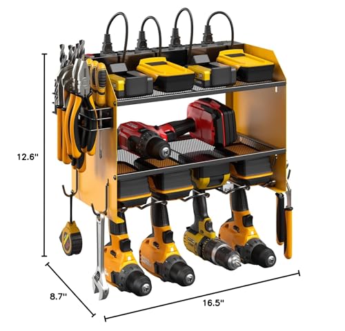- Very convenient for charging your tool batteries, All-in-one design and the metal power strip with surge protection of 1200J, Able to protect your device to a certain extent. Utility rack size: L:16.5in * W:8.7in * H:12in.