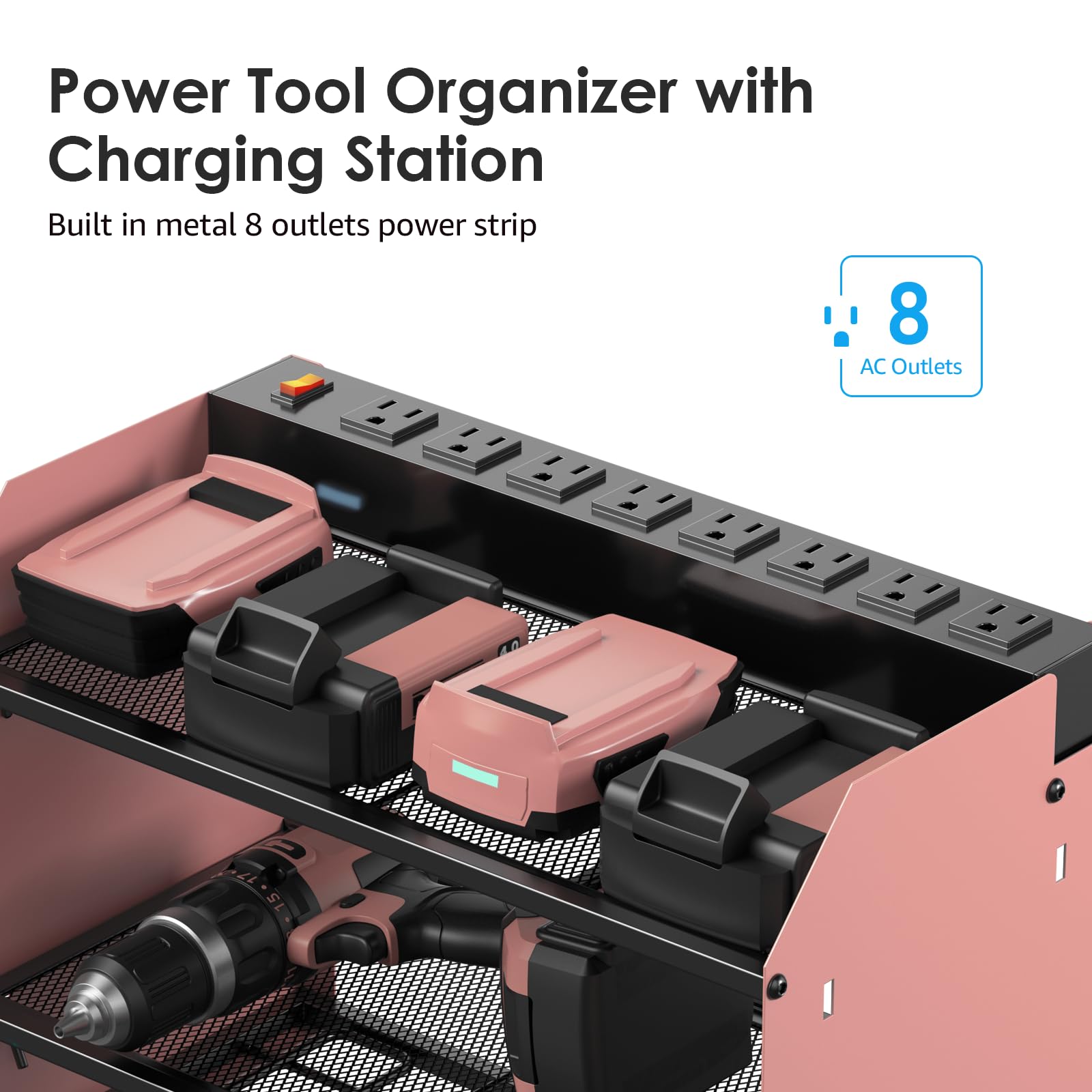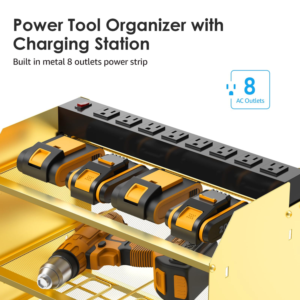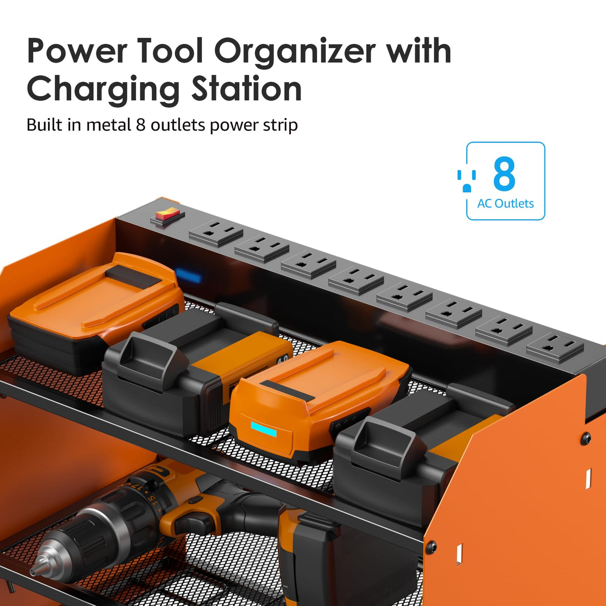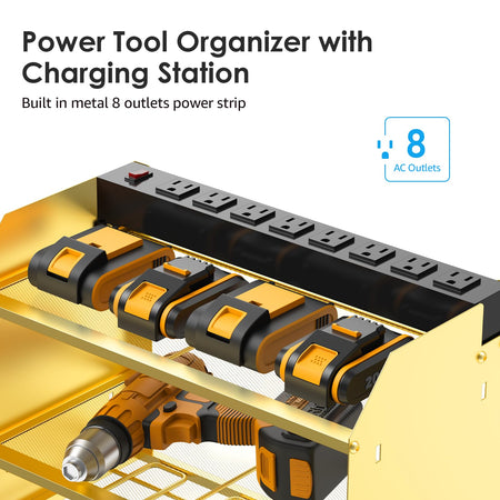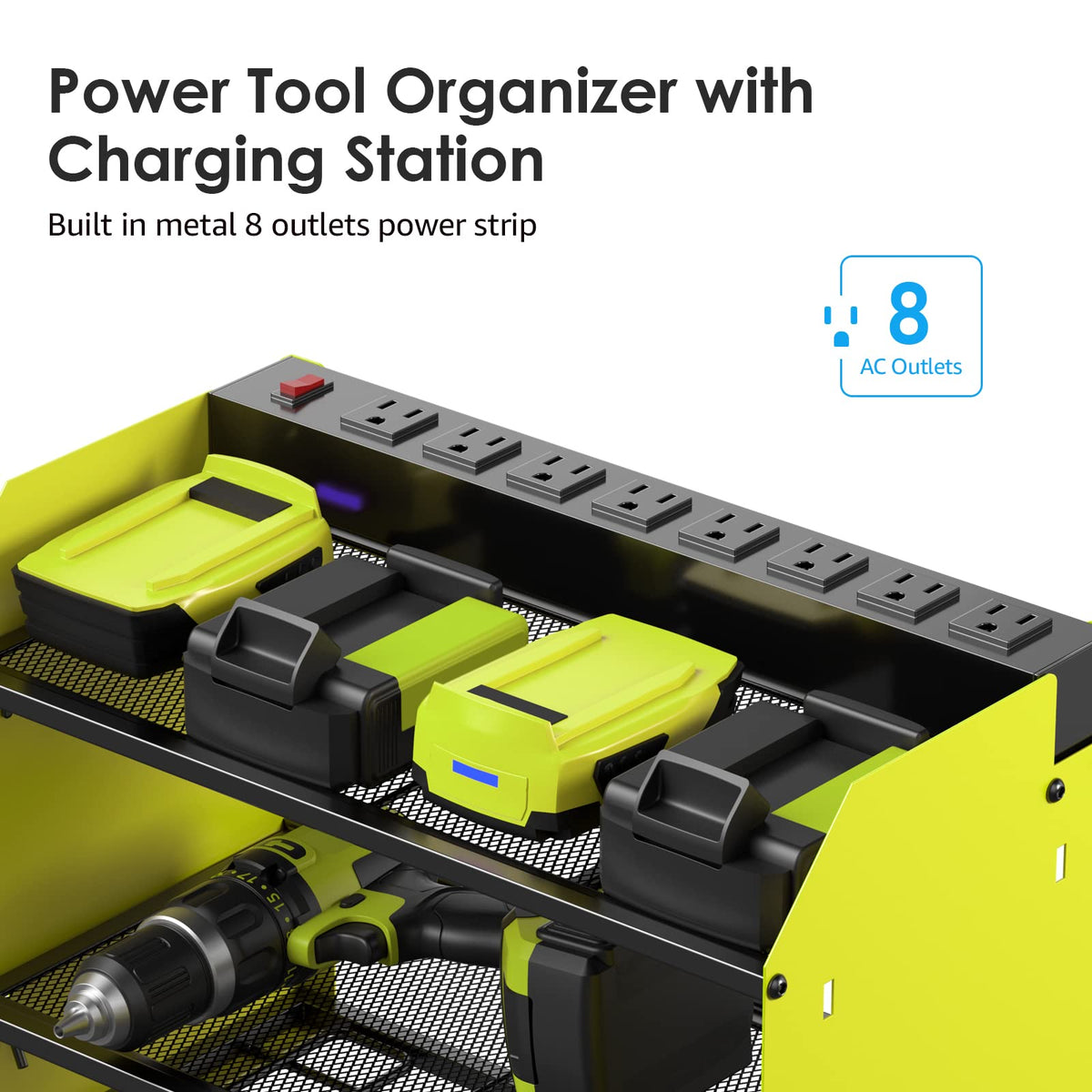 - Power tool organizer with charging station, come with 8 outlets. If you have a lot of rechargeable tools, you can charge everything right in the rack and avoid searching for sockets. 6ft power cord included.