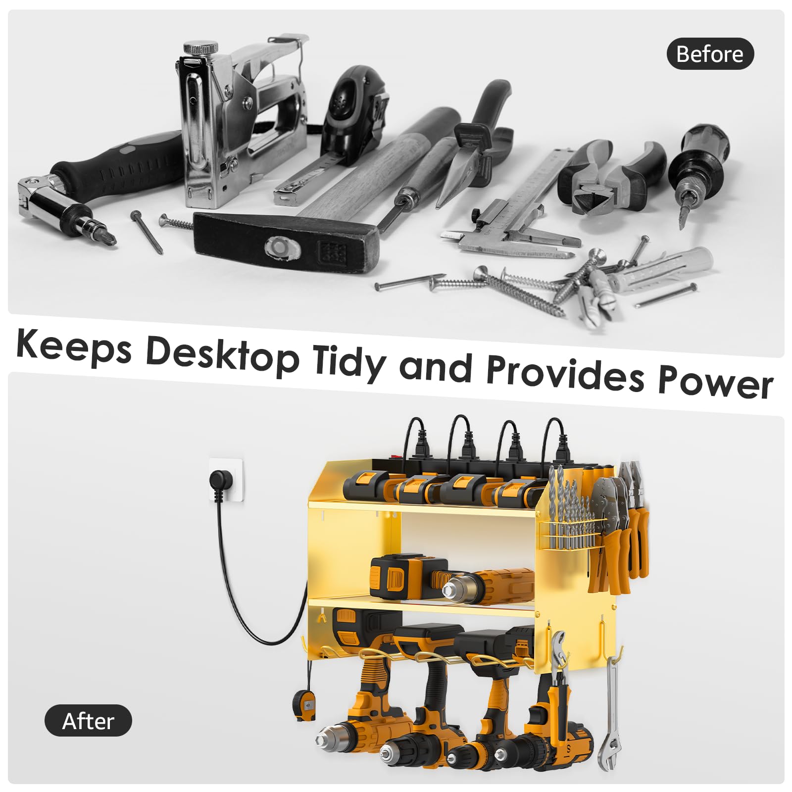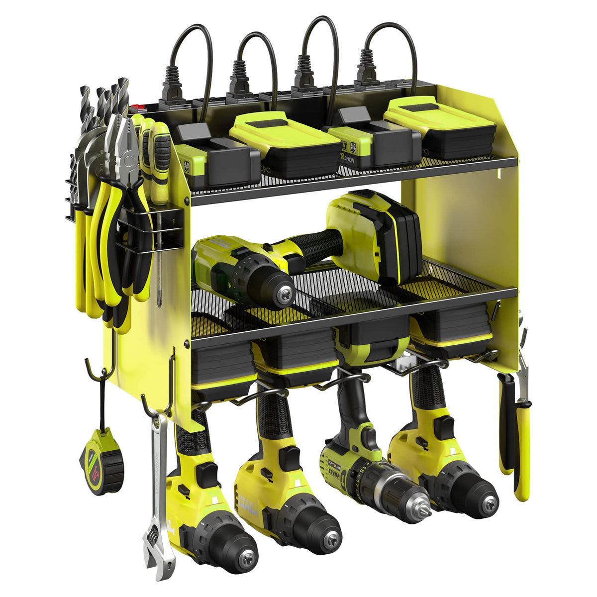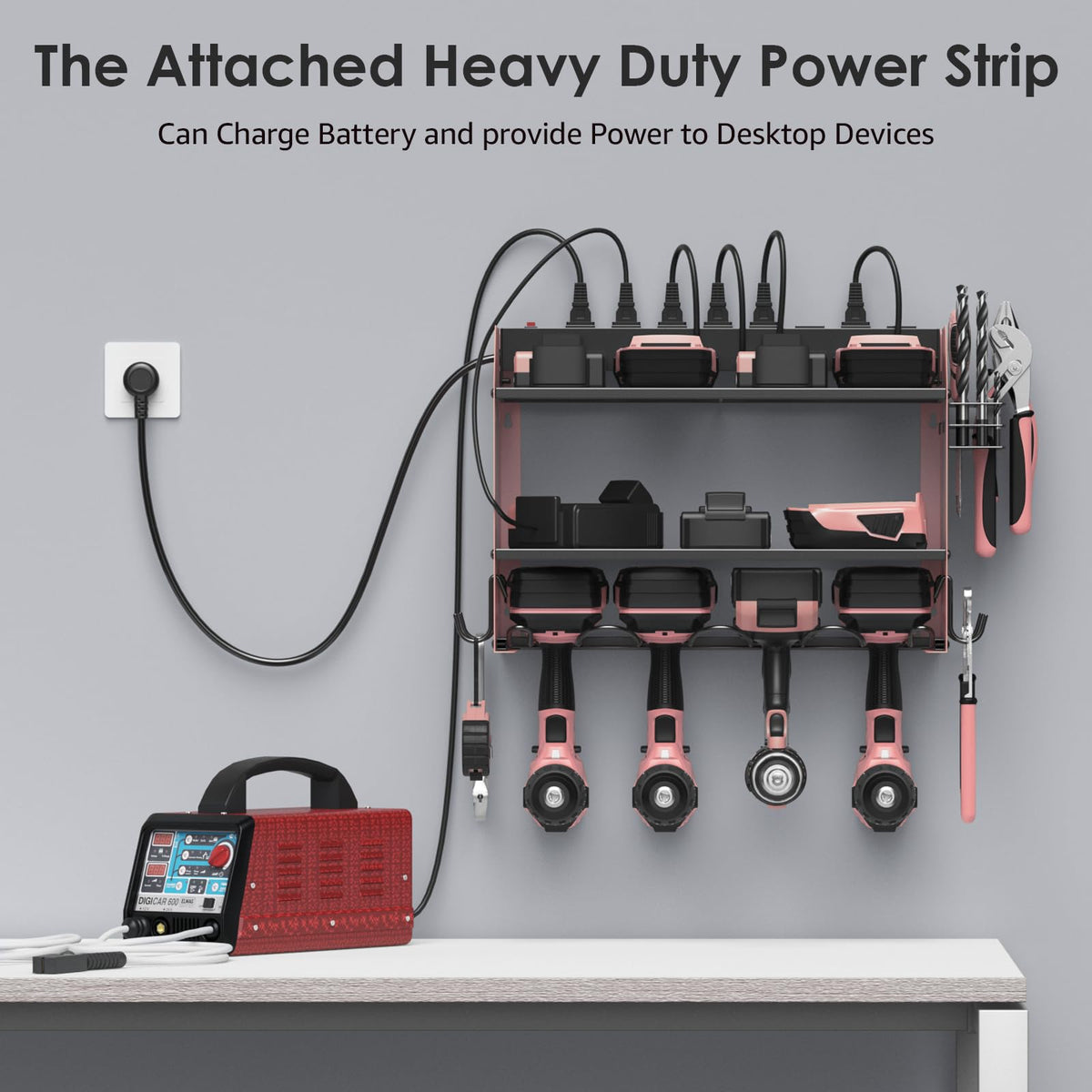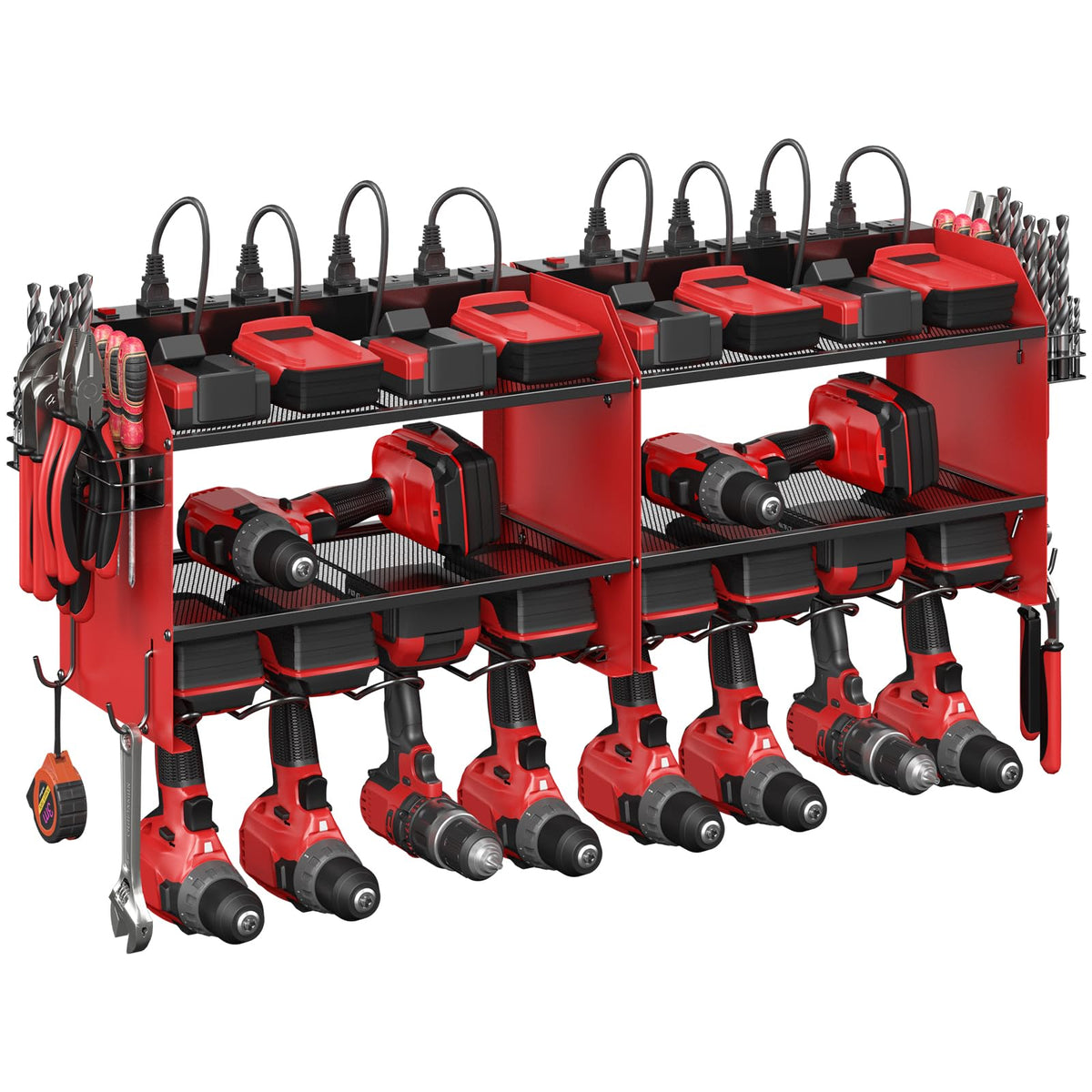 - Power tool organizer with charging station, come with 8 outlets. If you have a lot of rechargeable tools, you can charge everything right in the rack and avoid searching for sockets. 6ft power cord included.