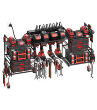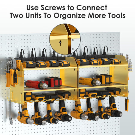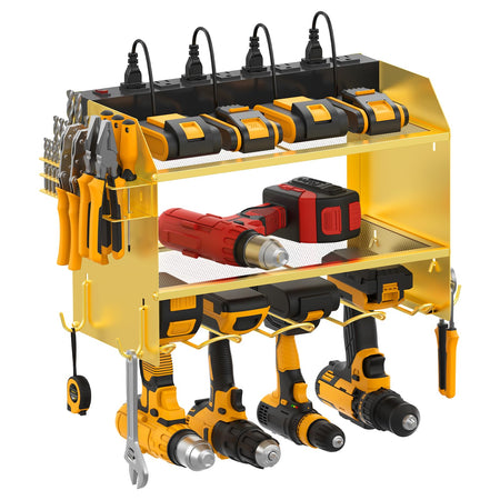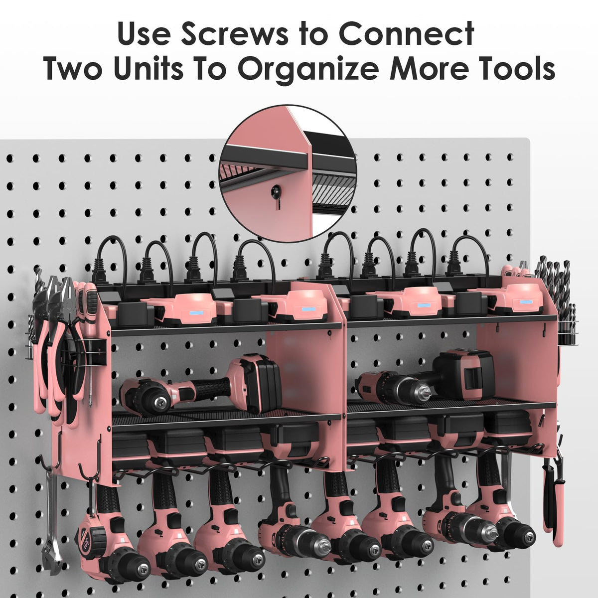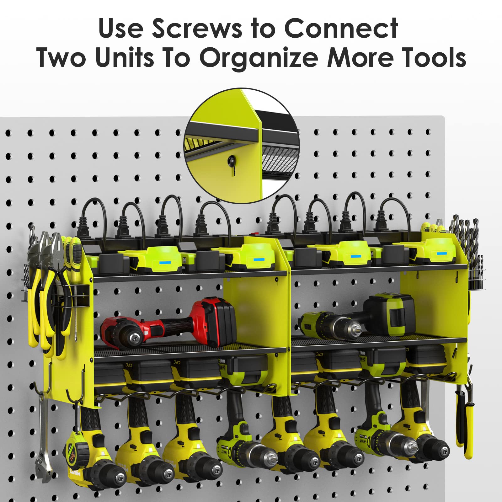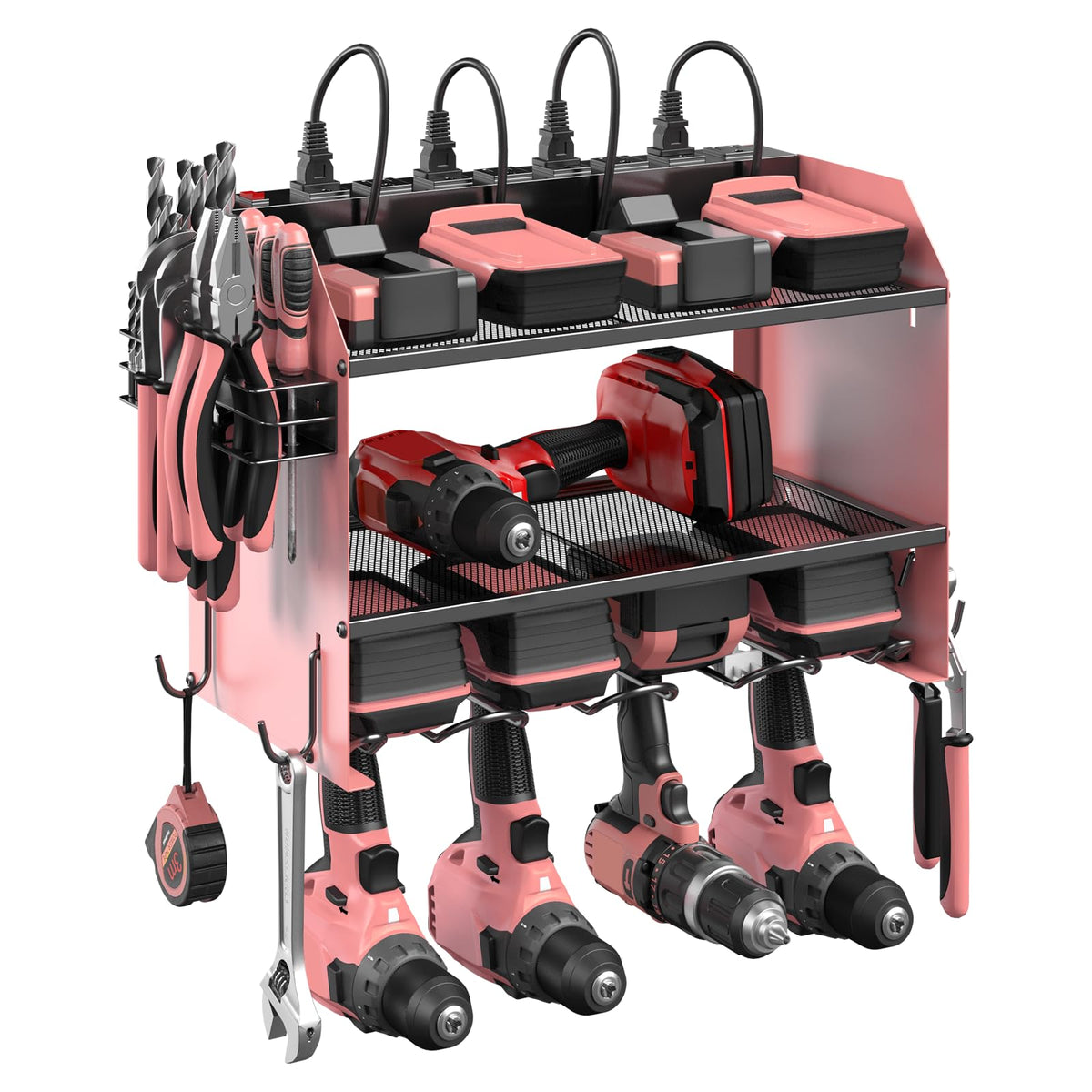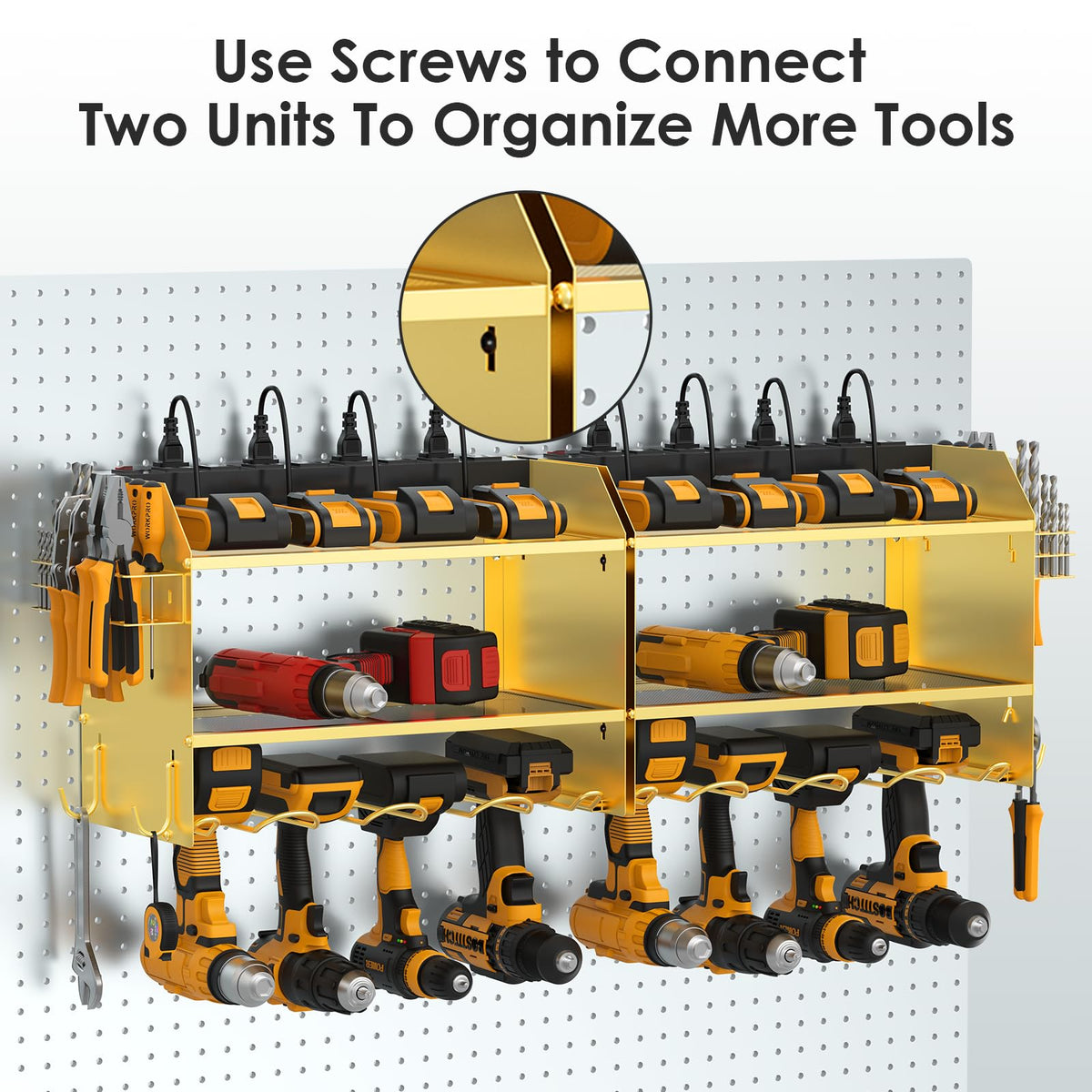 - Power tool organizer with charging station, come with 8 outlets. If you have a lot of rechargeable tools, you can charge everything right in the rack and avoid searching for sockets. 6ft power cord included.