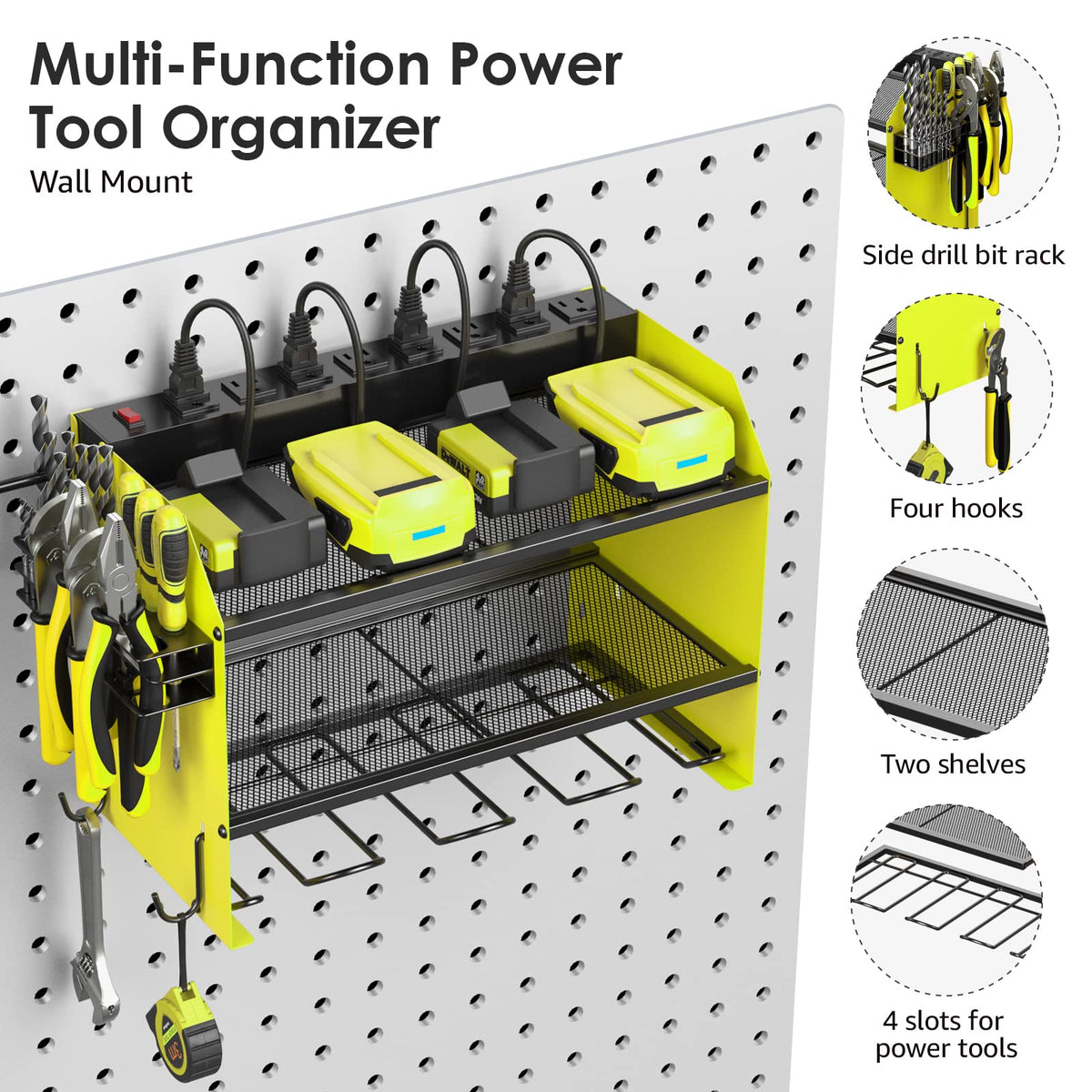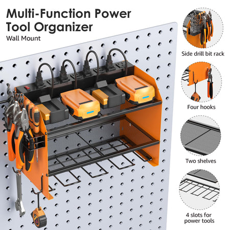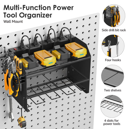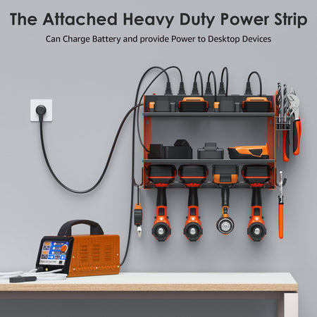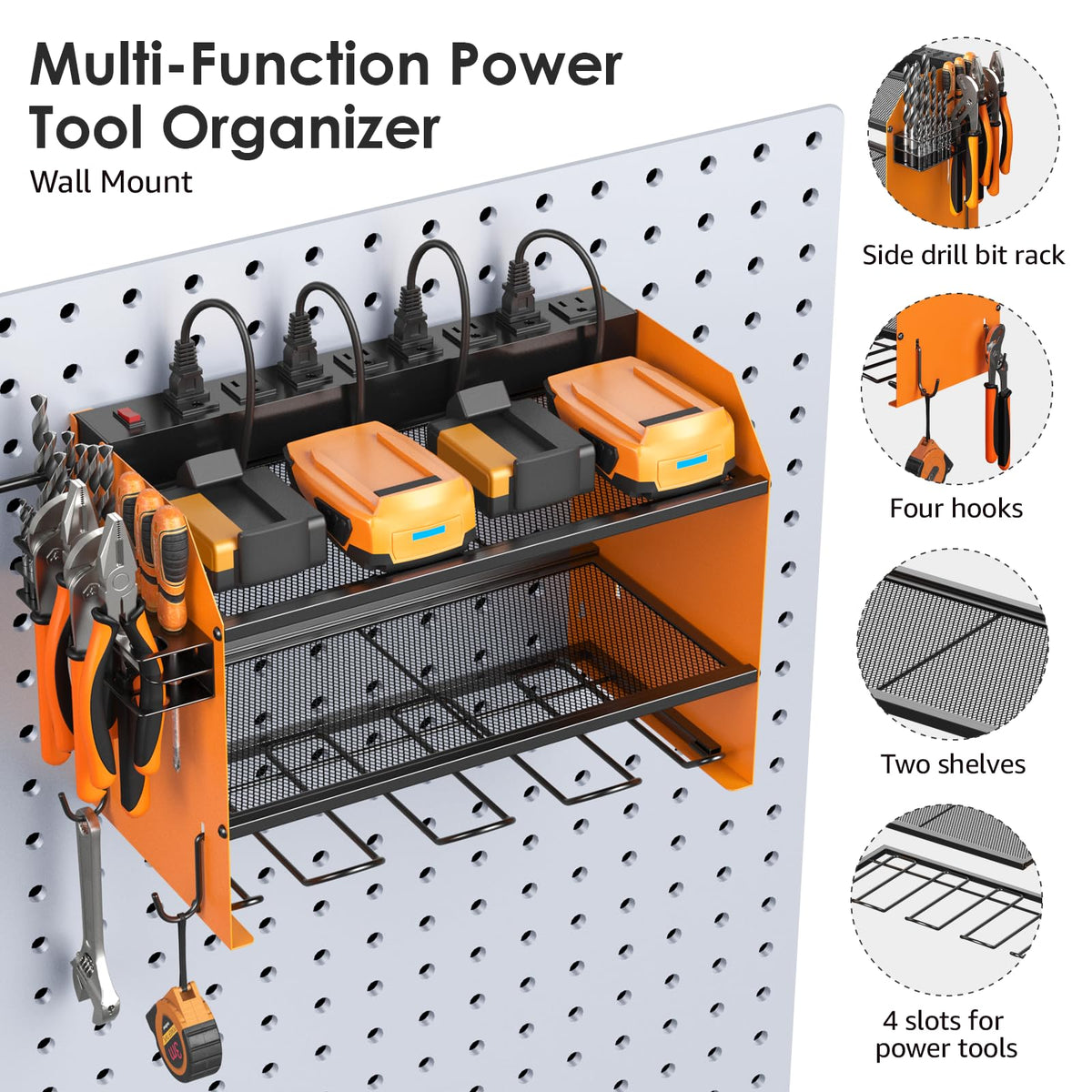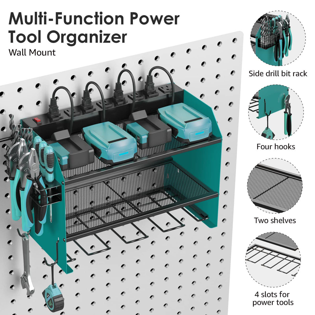 - Wall mount power tools organizer come with 4 slots, 4 hooks and drill bit rack, built-in power strip, double layer structure can keep rechargeable tools organized in the work area and save your bench space. The tools in the picture are for demonstration purposes only and are not included.