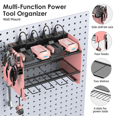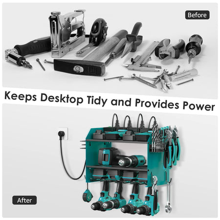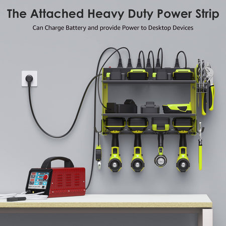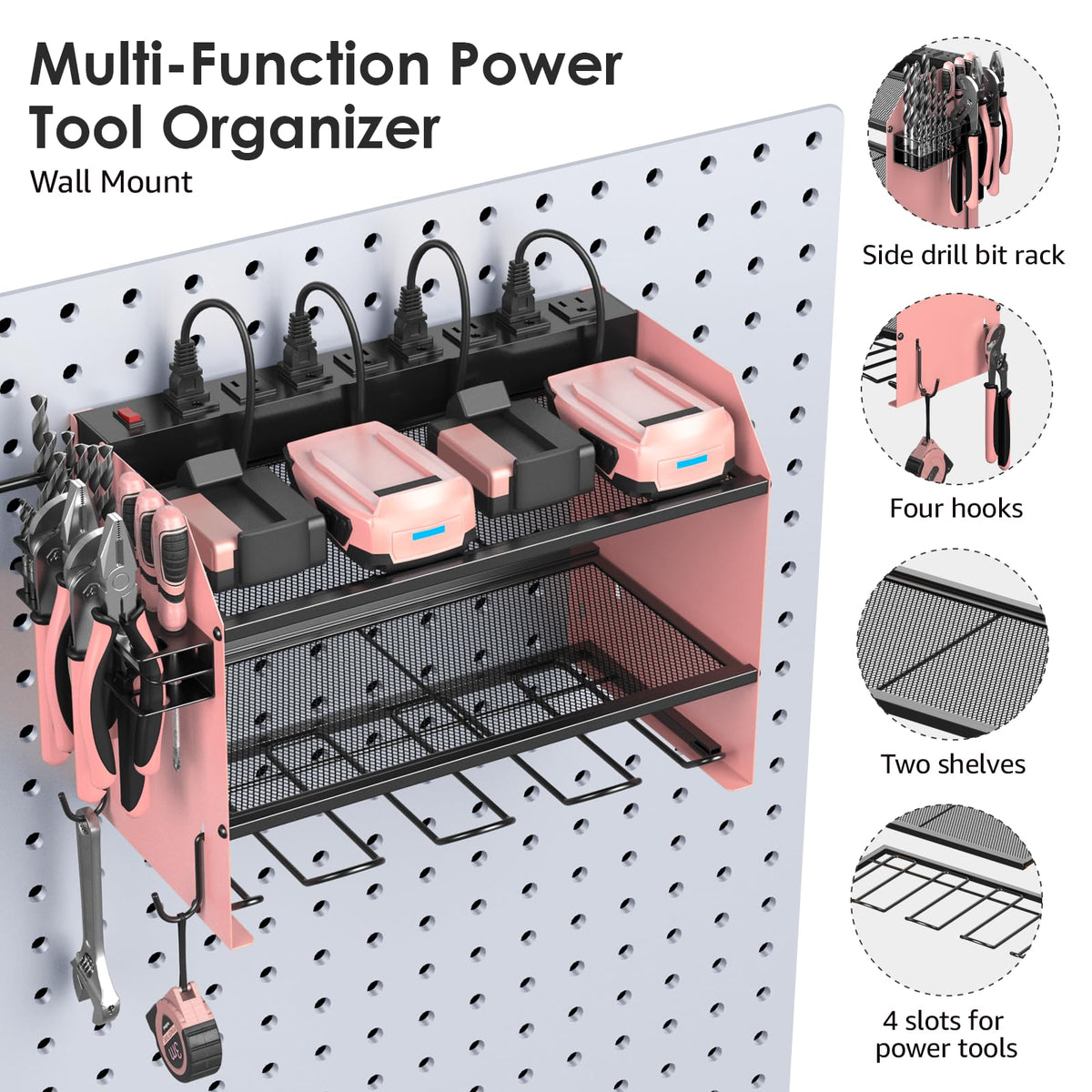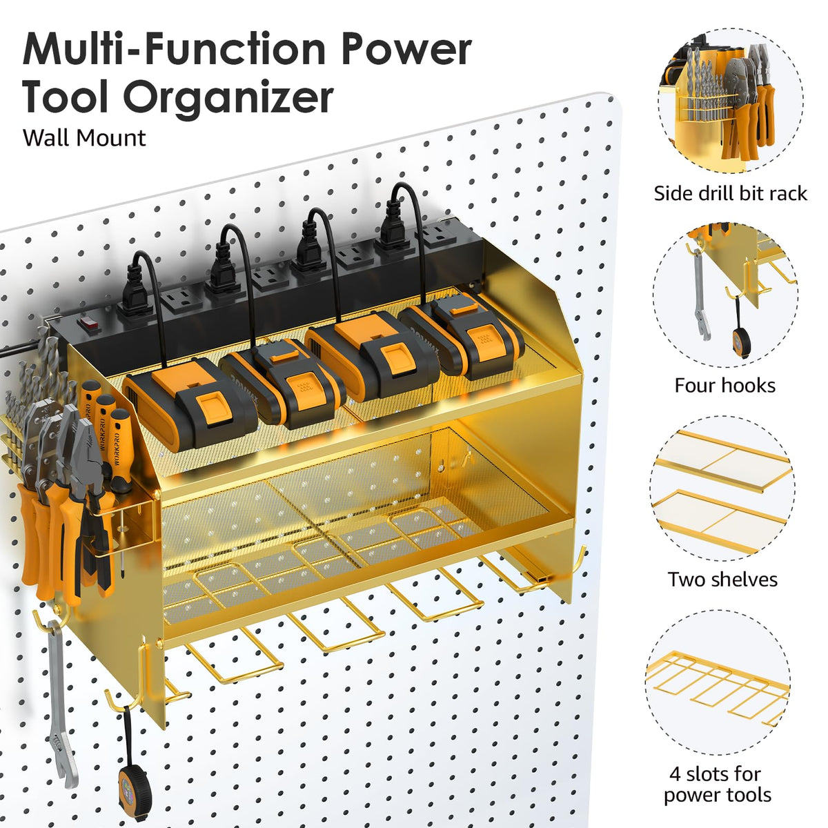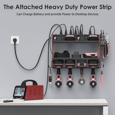 - Wall mount power tools organizer come with 4 slots, 4 hooks and drill bit rack, built-in power strip, double layer structure can keep rechargeable tools organized in the work area and save your bench space. The tools in the picture are for demonstration purposes only and are not included.
