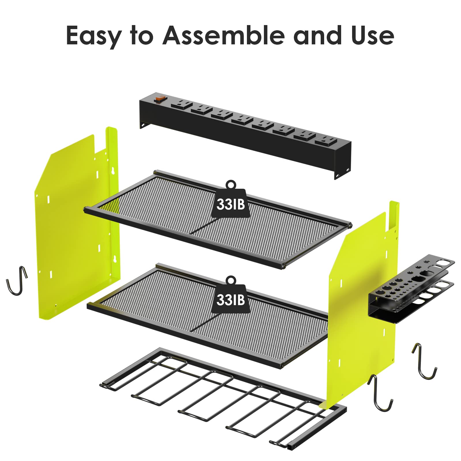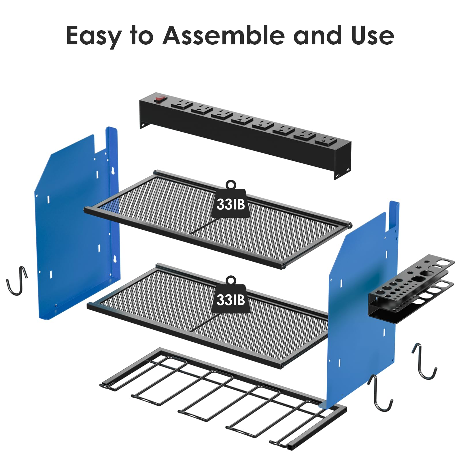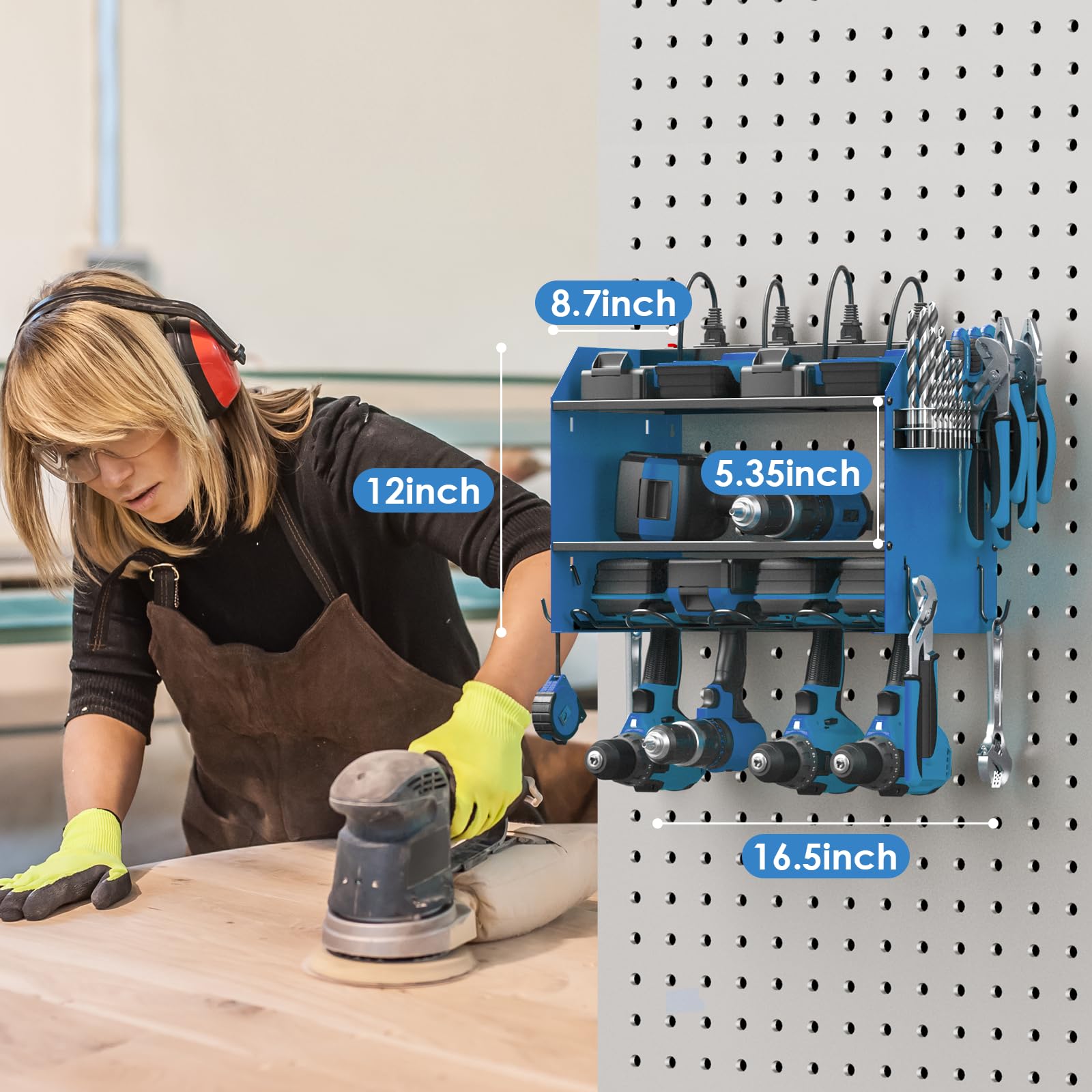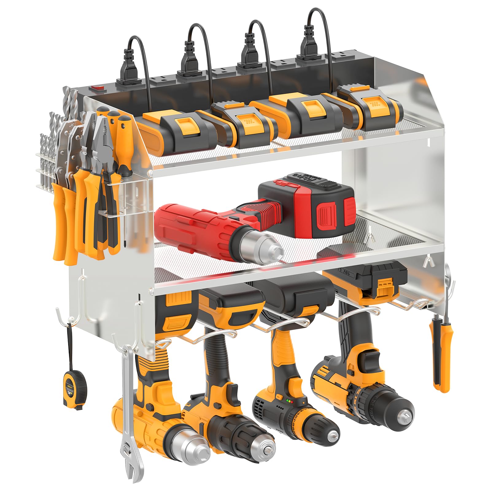 CCCEI Modular Power Tool Organizer Wall Mount with Charging Station. Garage 4 Drill Storage Shelf with Hooks, Screwdriver, Drill Bit Heavy Duty Rack, Tool Battery Holder Built in 8 Outlet Power Strip.