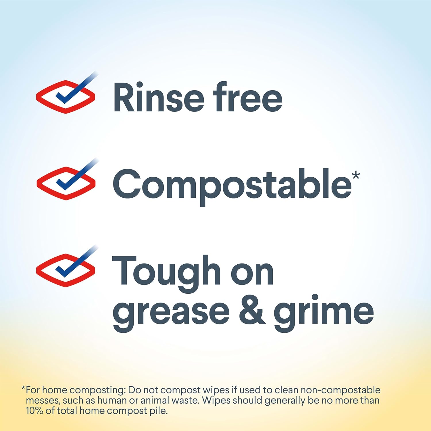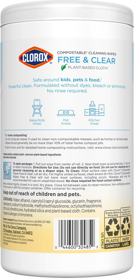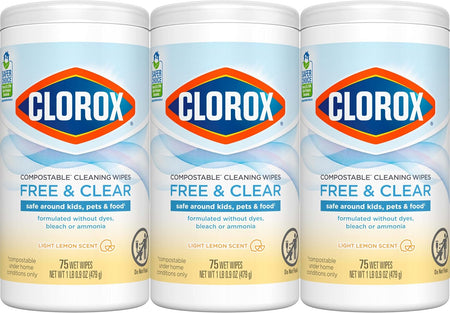 The clear solution for a clean home. Safe around kids, pets and food contact surfaces when used as directed, Clorox Free & Clear Compostable Wipes are formulated without dyes, bleach or ammonia yet deliver a powerful clean thats gentle on surfaces. These lemon scented Clorox wipes pick up dirt and compost back into dirt. These compostable wipes are tough on grease and can cut through grime on a variety of hard surfaces like acrylic, sealed fiberglass, sealed granite, finished hardwood and vinyl. The perfect addition to your household cleaning supplies, Clorox Compostable Wipes meet the US EPAs Safer Choice safer product standards. and made from plant based fibers that are compostable under home conditions only*. Grab these easy, accessible cleaning wipes for everyday cleanups and tough messes. *For home composting: Do not compost wipes if used to clean non compostable messes, such as human or animal waste. Wipes should generally be no more than 10% of total home compost pile. **When used as directed