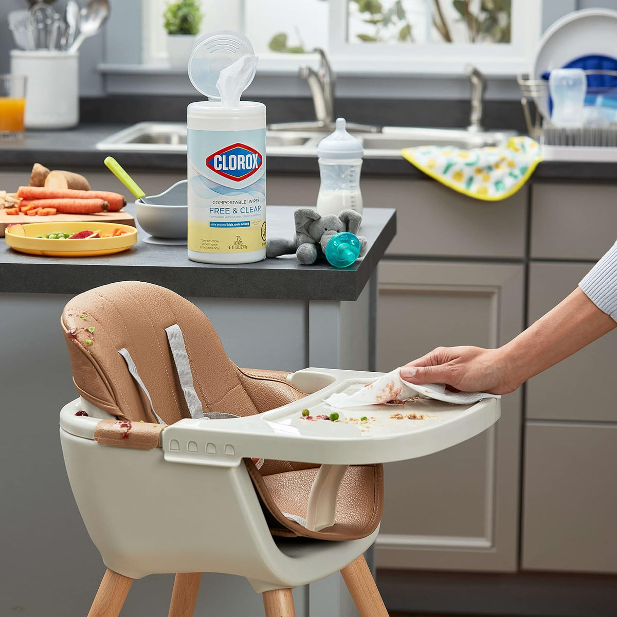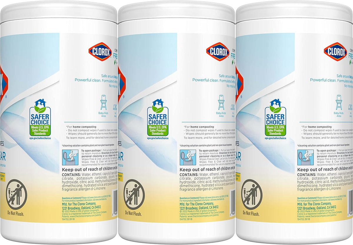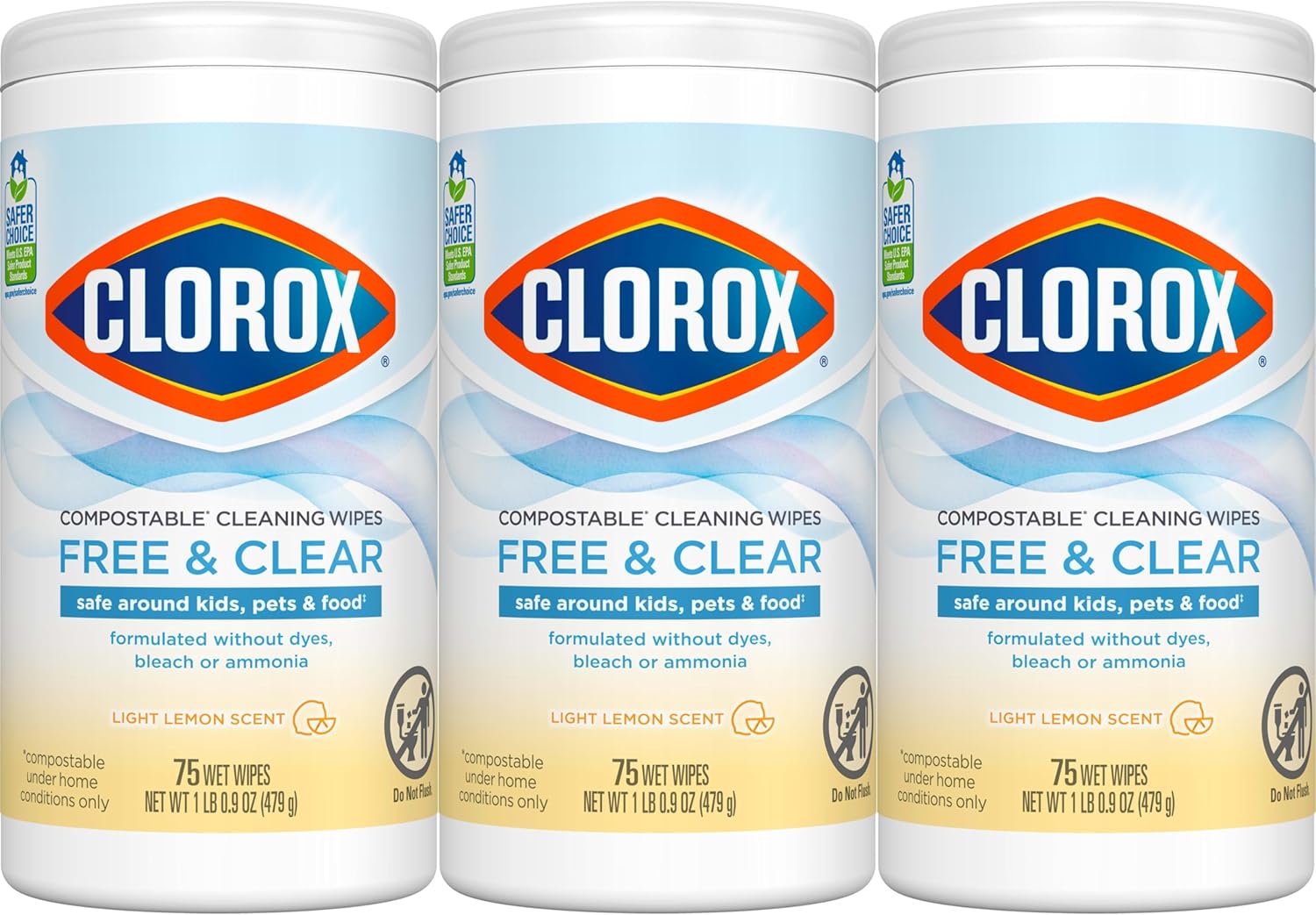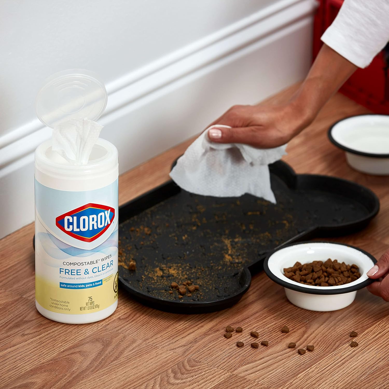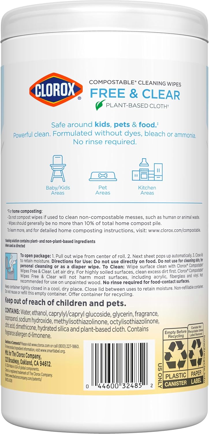 - FAMILY FRIENDLY: Clorox Free & Clear Compostable Wipes are formulated without dyes, bleach or ammonia to get the surface clean you want from the brand you trust