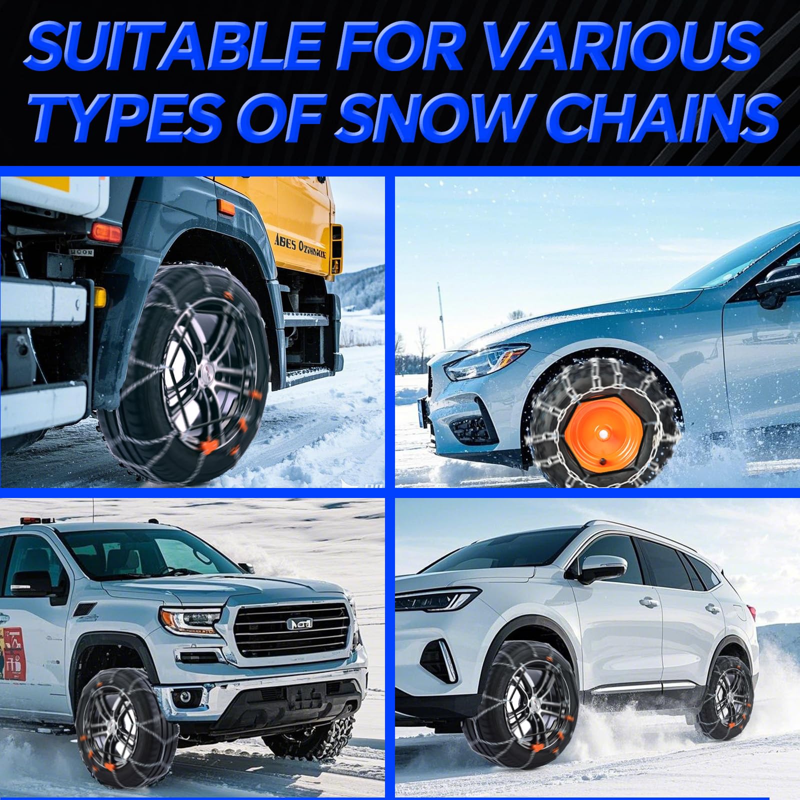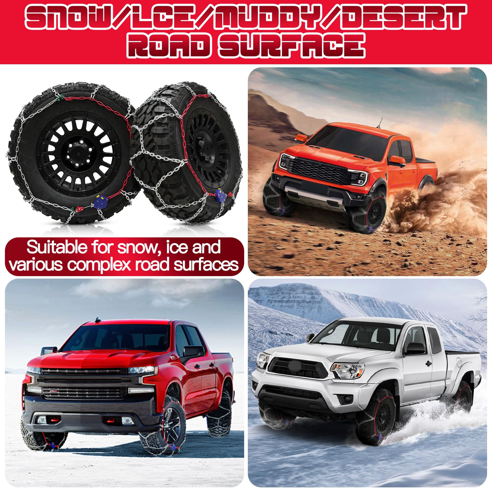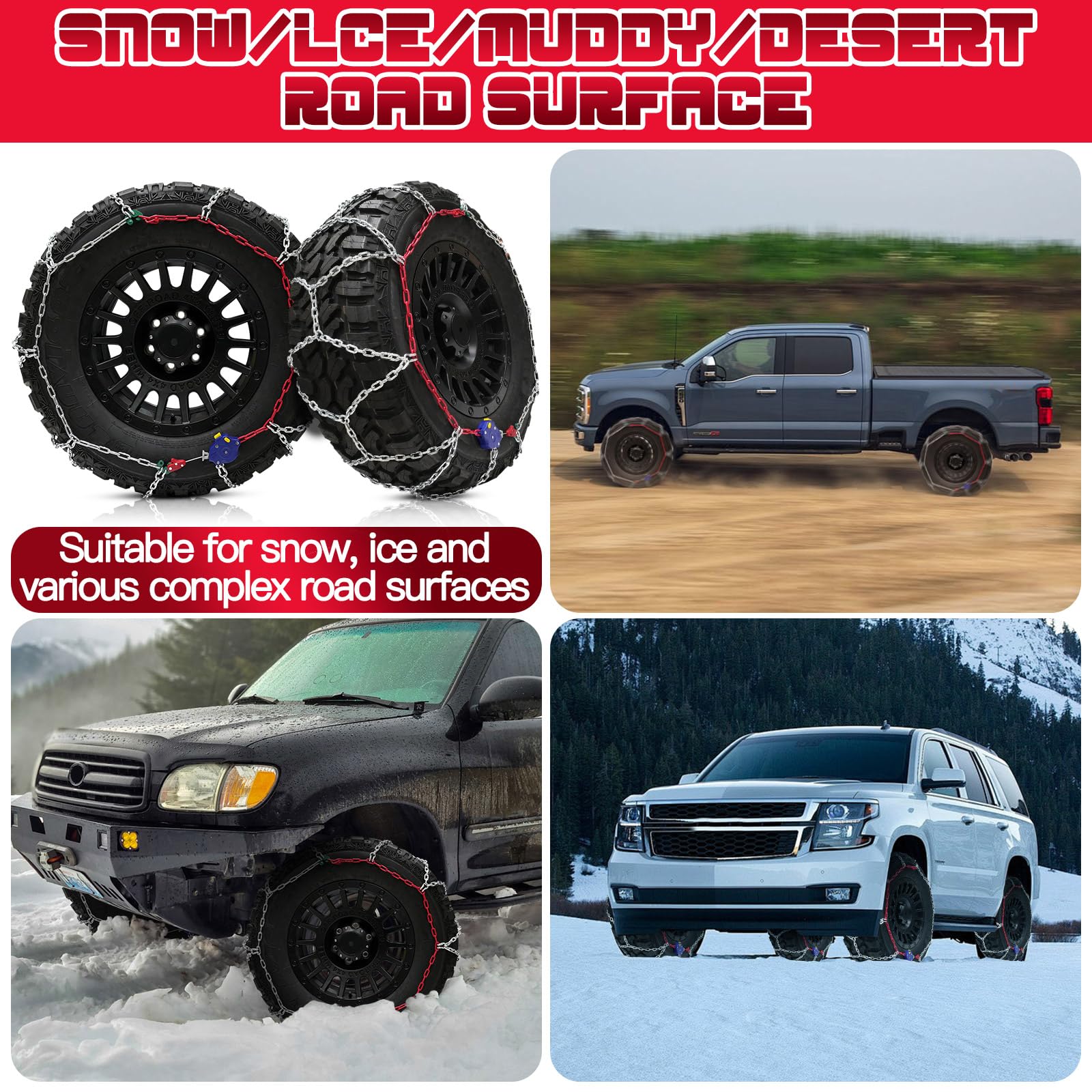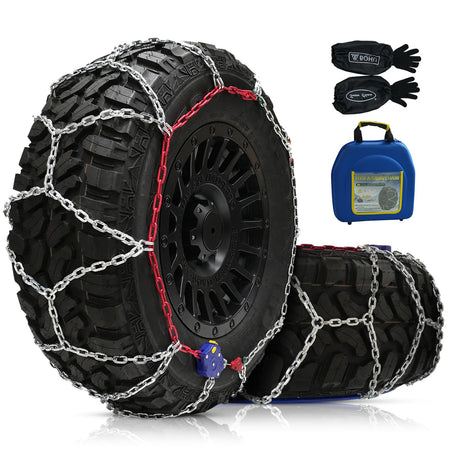- 【for Pickup Trucks and Off-Road SUV】Tire chains specifically designed for pickup trucks and off-road SUV, crafted from thick alloy manganese steel and do not break easily. The chain diameter is 4.5 mm for excellent traction and grip.