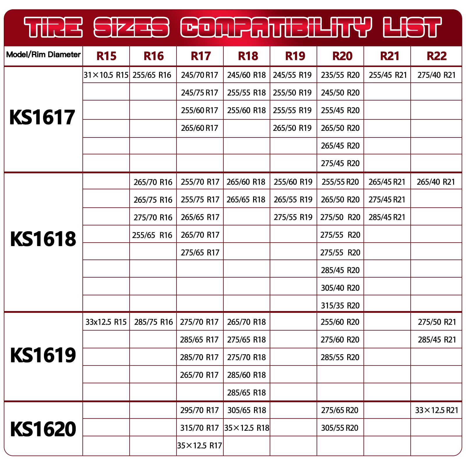 - 【Suitable for Tire Size】265/75R16, 275/70R16, 255/70R17, 255/75R17, 265/65R17, 265/70R17, 275/65R17, 255/65R18, 255/70R18,265/60R18, 265/65R18, 255/60R19, 265/55R19, 275/55R19, 255/55R20, 265/50R2, 275/50R20, 265/55R20, 275/55R20, 285/45R20, 305/40R20, 265/45R21, 275/45R21, 285/45R21, 265/40R22