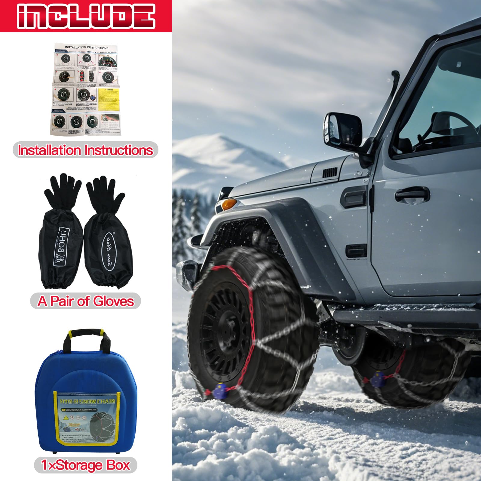 - 【Attention】Please choose the right snow tire chains according to the model of your car tire, the picture have very complete fitment information.