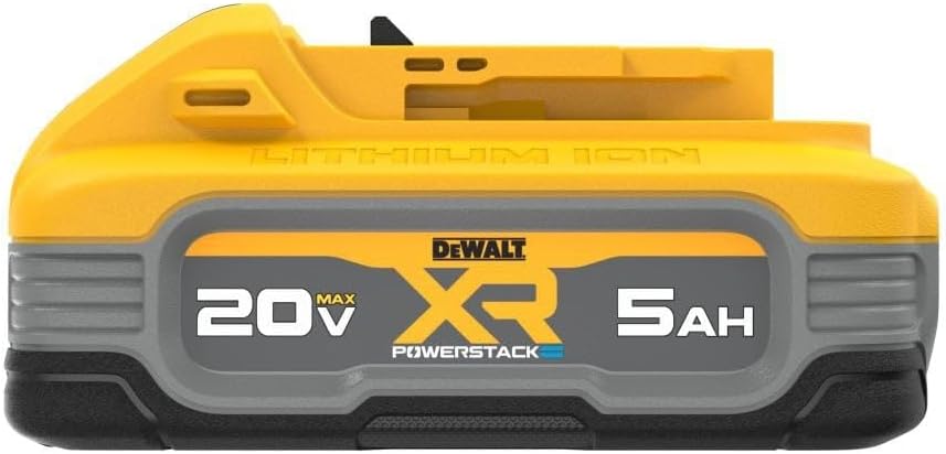 Our most powerful battery in its class, the 20V MAX* XR POWERSTACK 5.0 Ah Battery utilizes revolutionary pouch cell technology to deliver 50% more power, 50% more work per charge, and 2X the lifespan. Compatible with all DEWALT 20V MAX* tools and chargers, the XR POWERSTACK 5.0 Ah Battery features an impact-resistant, rubber overmolded base and includes 3-LED Fuel Gauge state of charge indicator.