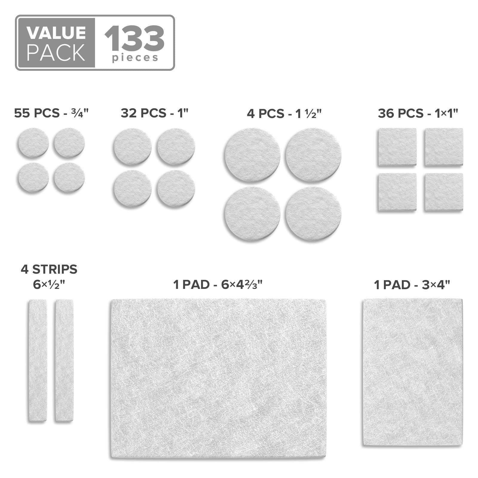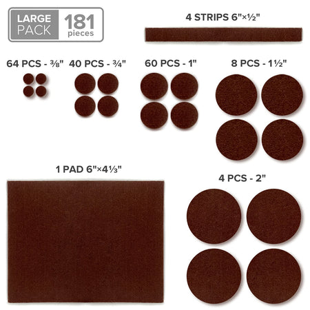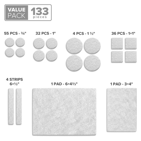- ✌ ONLY NOW 1 + 1 PACK X-PROTECTOR! 1 brown (106 pieces: (45) ¾”, (24) 1”, (36) 1x1”, (1) 3x4”) + 1 beige (27 pieces: (10) ¾”, (8) 1”, (4) 1 ½”, (4) ½x6”, (1) 4 2/3x6”). Total 133 chair glides. That’s all furniture floor protectors You need at home – brown for dark furniture and beige for bright furniture.