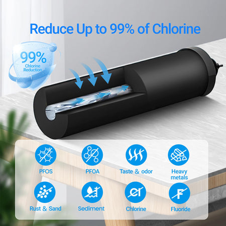 - High efficiency filtration: The black water filter, with the same strong purification capacity as the original filter this filter, can reduce up to 99% of chlorine. It also can reduce heavy metal, sediment, chlorine, sand, rust, odor and large particles in source water, improving the taste of water.