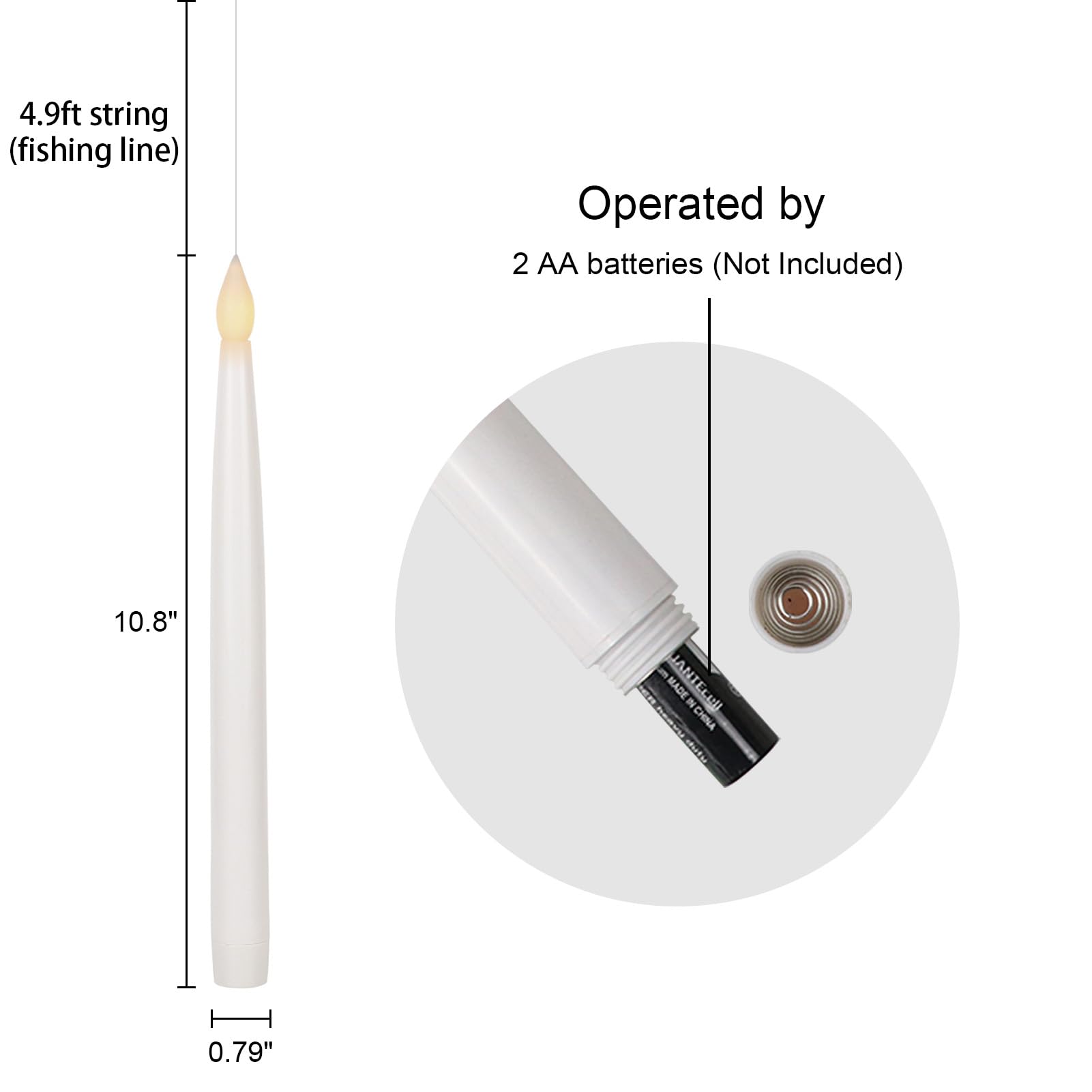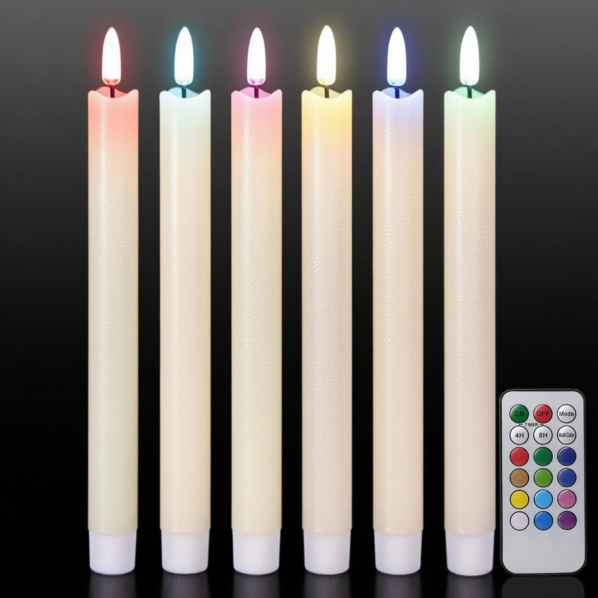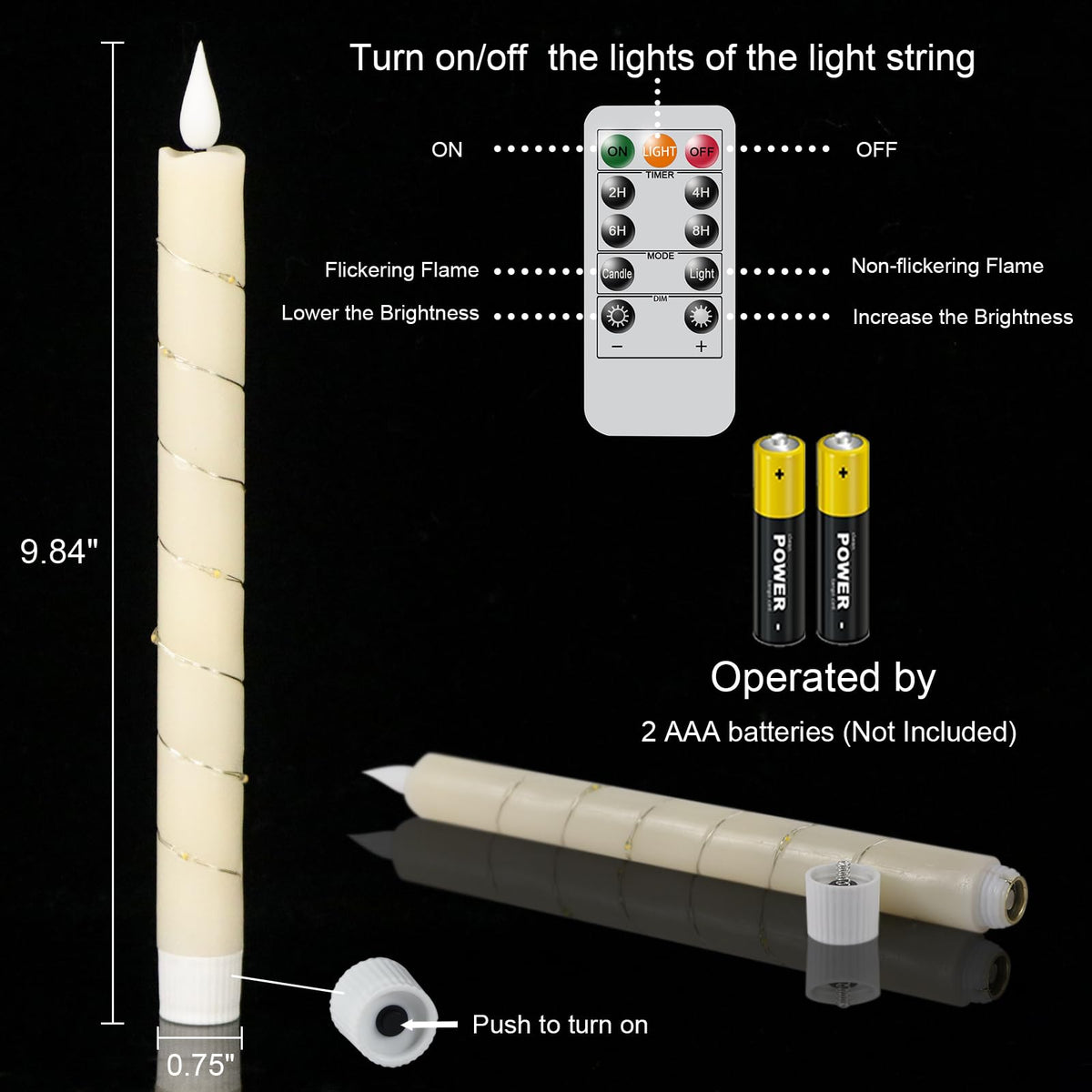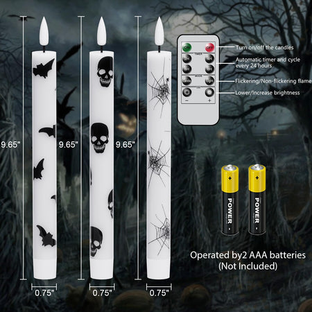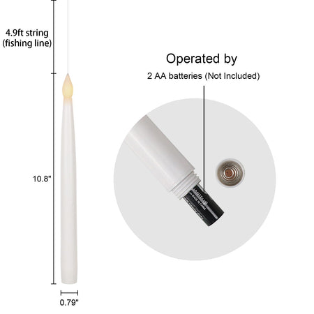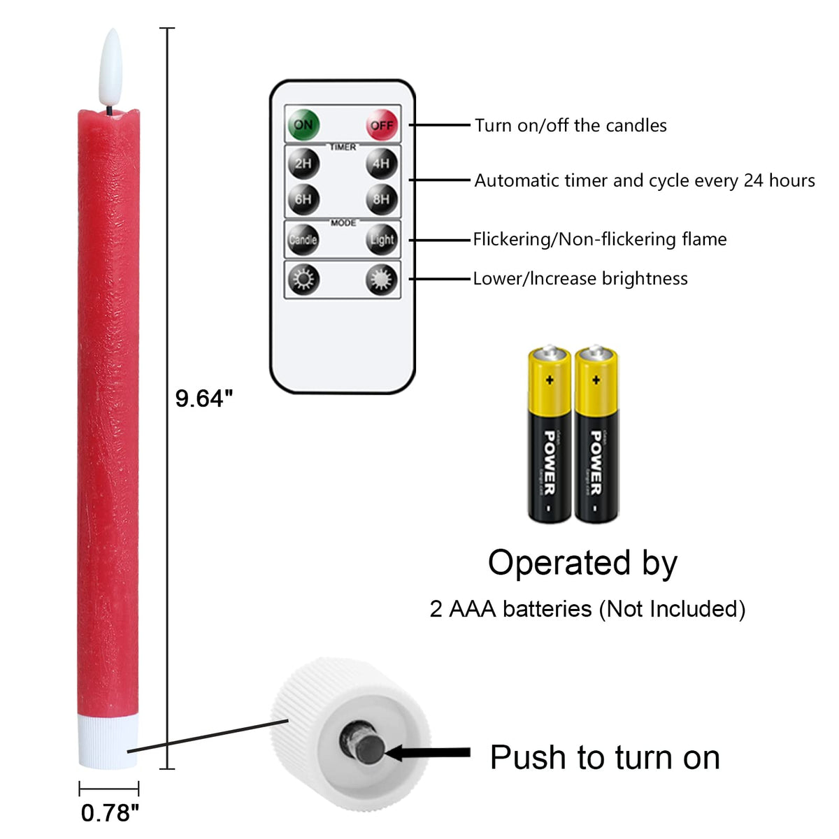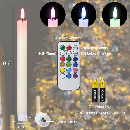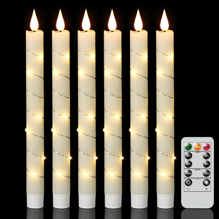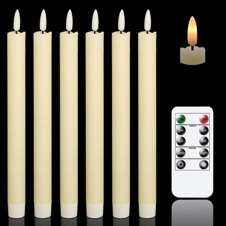 - A COMPLETE SET OF FLAMELESS TAPER CANDLES: This value pack comes with 6 beautiful flickering flameless taper candles, one remote control with 10 different keys and a super easy to follow operating manual. Specifically, this set includes six flickering flameless taper candles(9.64 inch high x 0.78 inch diameter). Each candle operated by 2 AAA batteries(not include). Note: This product does not include candle holders.