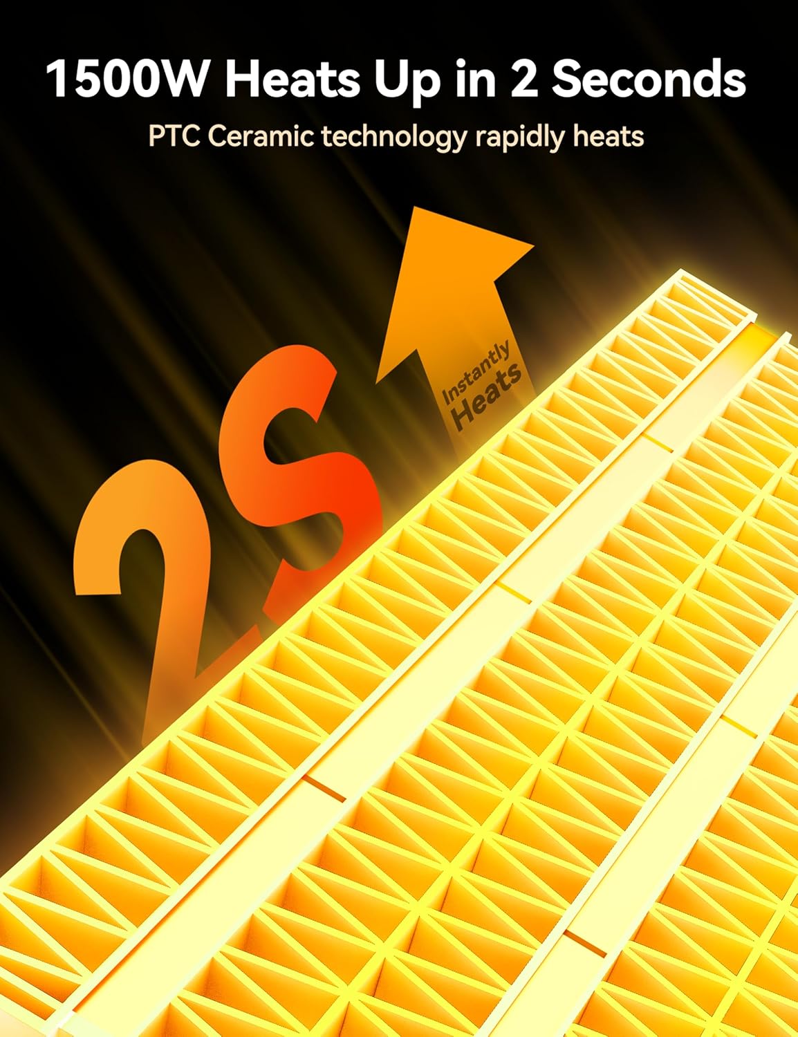 - Quiet and fast heating: The noise this ceramic heater makes is lower than 45 decibels, quiet enough for most people to use in a bedroom while sleeping. With PTC ceramic heating tech and high speed fan, this heater put out tons of heat to heat up 200 square feet in seconds