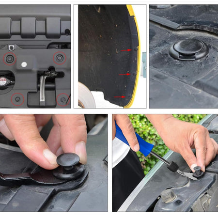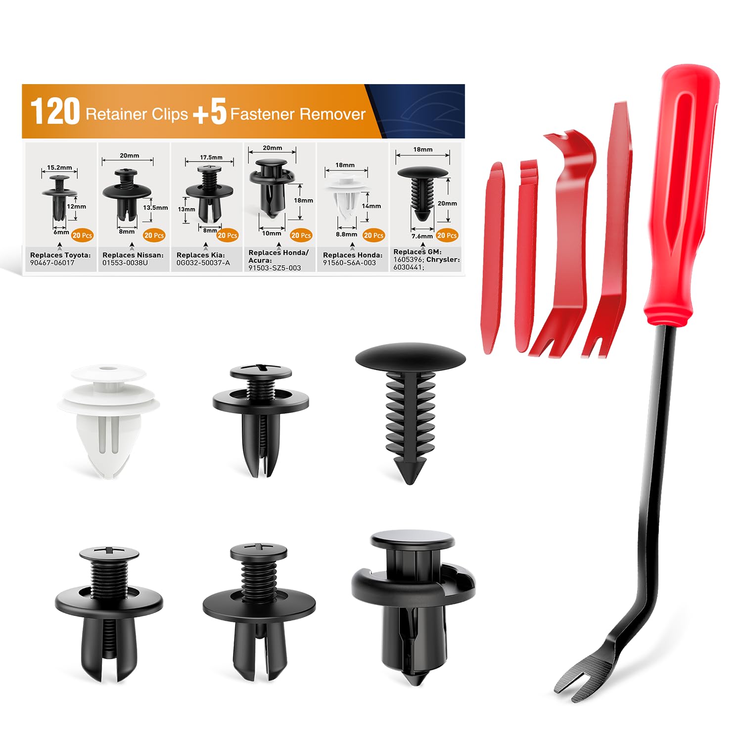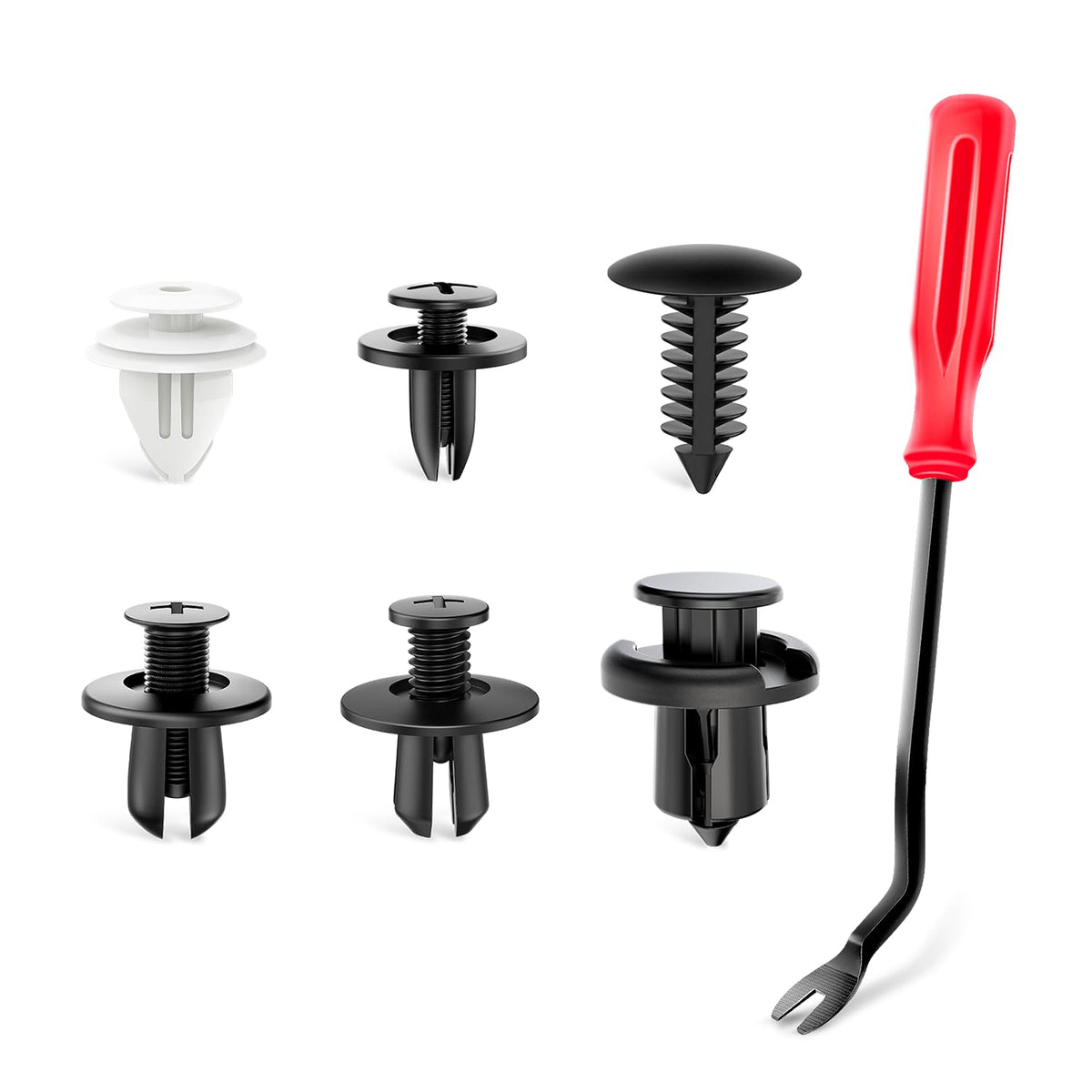 - UNIVERSAL FIT KIT - Great Assortment Push Retainer Kit with 6 popular size, fitting for door trim, radiator shield yoke, fender, bumper and splash shield retainers replacement for Ford, GM, Chrysler, Toyota, Honda and more.