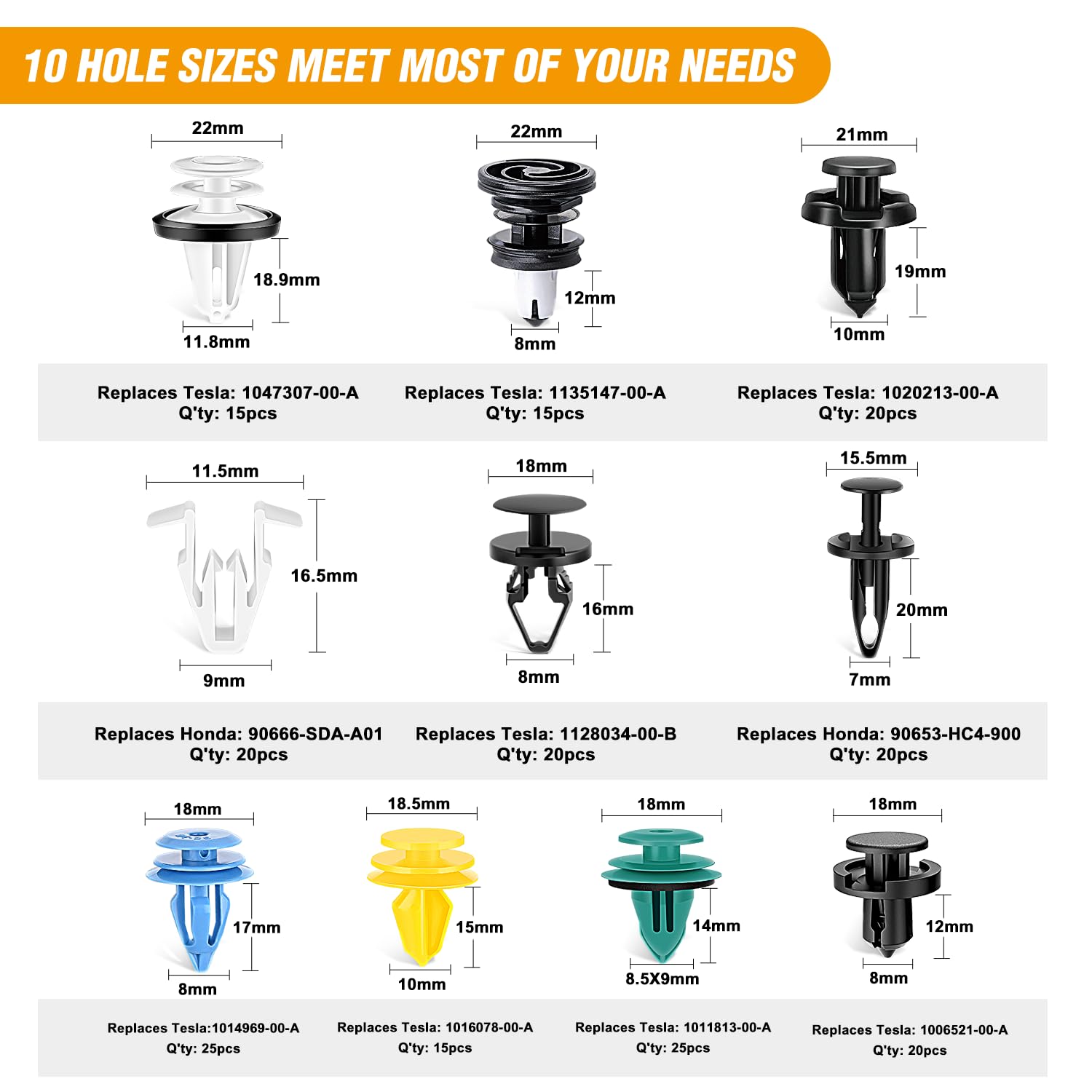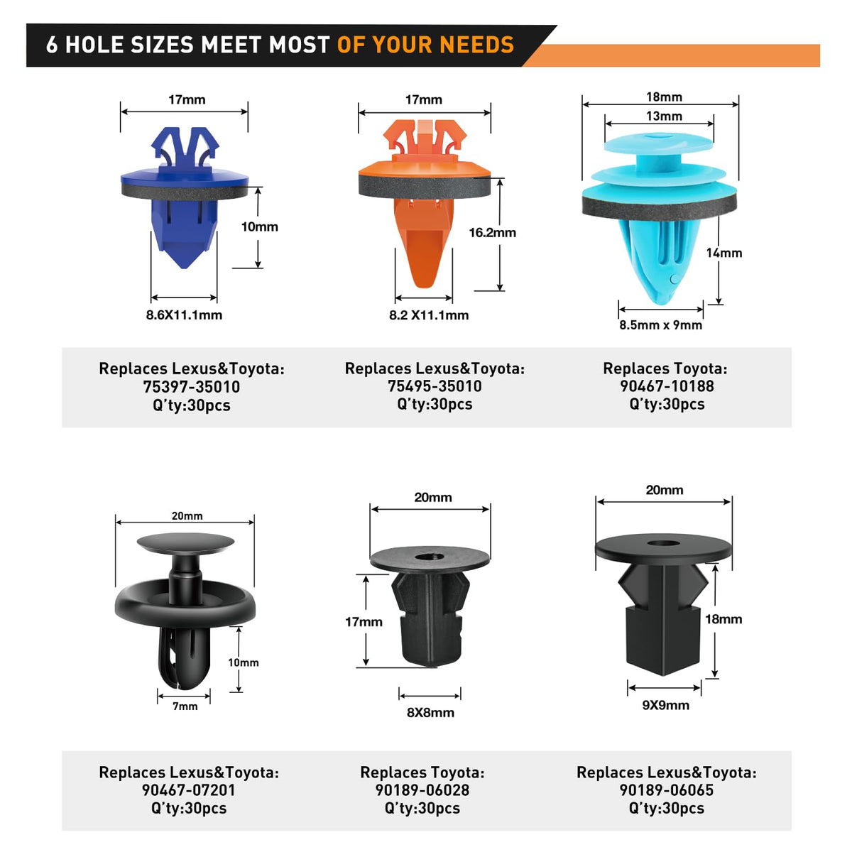 - Package Include:Includes 30 pcs 6mm Clips ,30 pcs 7mm Clips, 30 pcs 8mm Clips(YT:1362), 50 pcs 8mm Push Clips(YT:3143), 30 pcs 9mm Clips, 30 pcs 10mm Clips.