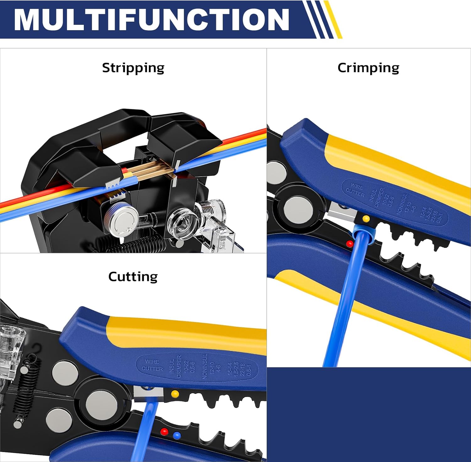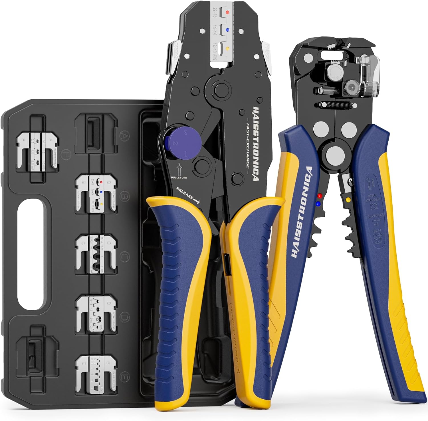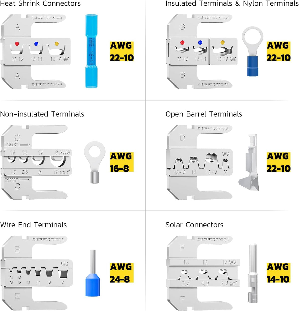 - Versatility at Its Best: The crimping tool set is designed to meet all your crimping needs. With 6 types of crimping dies you can confidently tackle various connectors, including heat shrink connectors, insulated connectors,non-insulated connectors, open barrel connectors, wire end terminals, and female/male terminals & solar connectors. 1*Automatic wire stripper tool. One toolset to rule them all