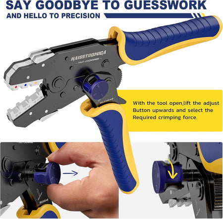 - Faster and Stronger: We understand the frustration of jaws constantly falling off during crucial tasks. Therefore, we upgraded the replacement method: quickly replace the crimping mold by pressing both sides, so it is firm and will no longer fall
