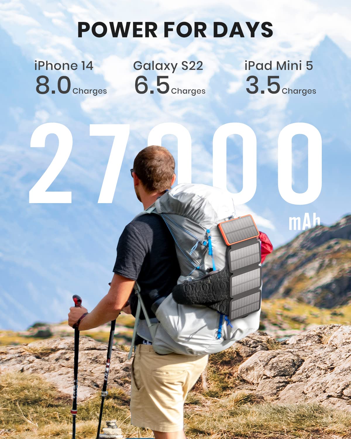 - Power for Days: The solar charger boasts a massive 27000mAh capacity, allowing you to charge an iPhone 8 times or a tablet 3.5 times before needing to recharge the power bank itself.
