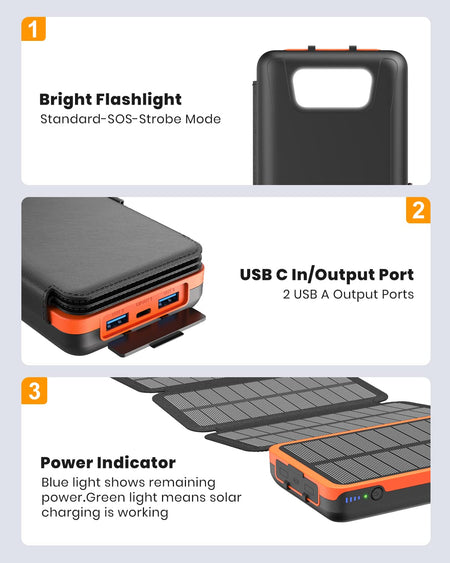 - Solar Charging: Equipped with 4 solar panels and capable of generating up to 6W of power in direct sunlight, the solar power bank provides a reliable source of energy to recharge your devices when you're off the grid.