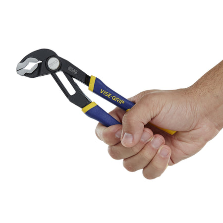 This IRWIN VISE-GRIP GrooveLock 2-Piece Locking Pliers Set includes 8-inch and 10-inch GrooveLock pliers with a press-and-slide button to quickly adjust the lower jaw. This all-purpose jaw grips on round, flat, square and hex shapes. More groove positions provide the optimum hand location for a better grip on the workpiece. Firmly grasp each pair of locking pliers thanks to the ProTouch grips.