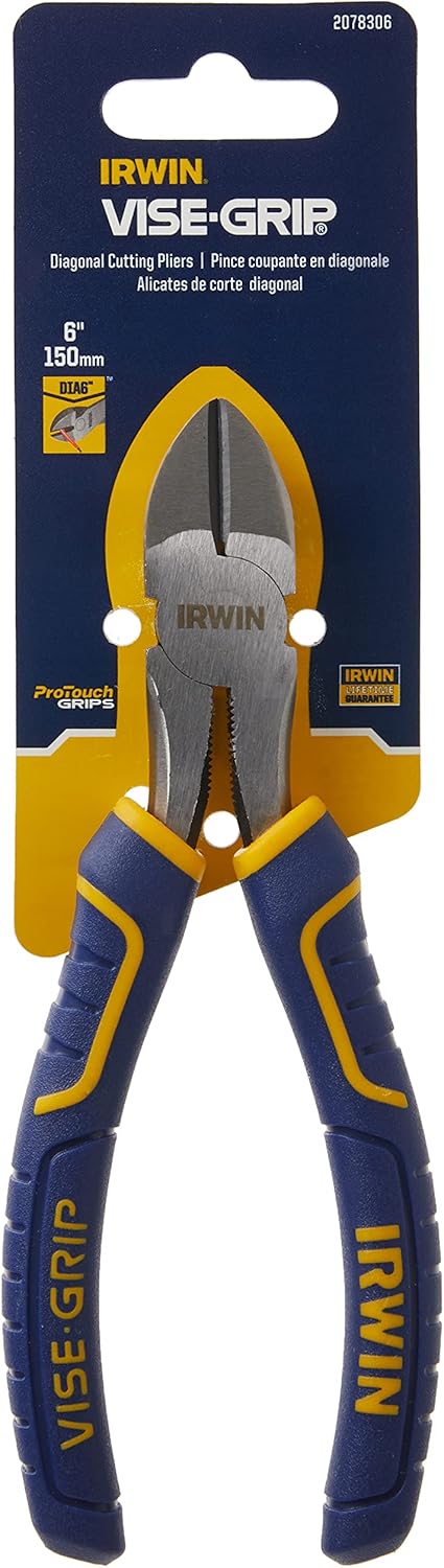 The IRWIN VISE-GRIP Diagonal Cutting Pliers are durably constructed from nickel chromium steel with ProTouch grips for extra comfort and reduced hand fatigue. With an induction hardened cutting edge and machined jaws for maximum gripping strength..