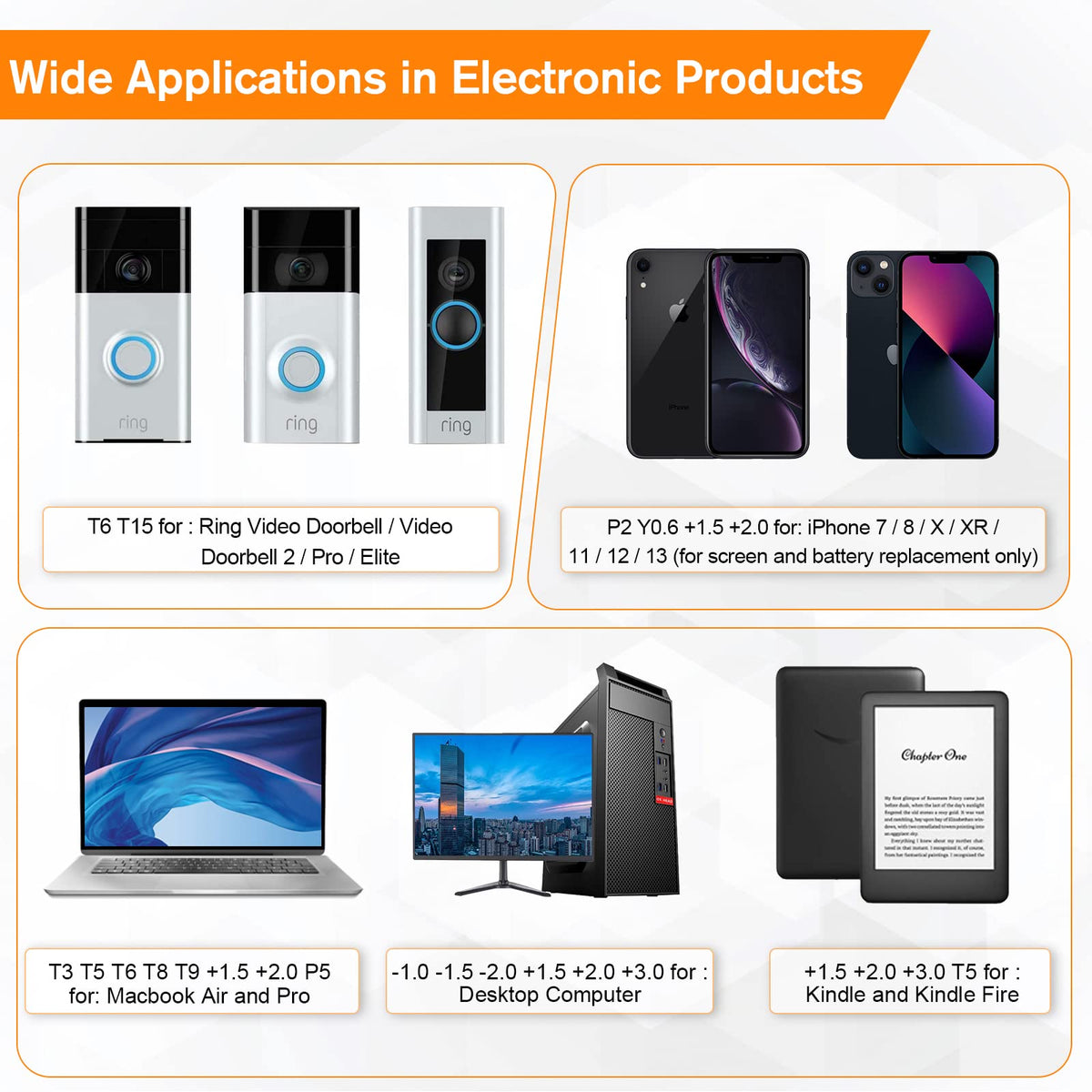 - 【Wide scope of application】-- +1.5/2.0 P2 Y0.6 MID2.5 are used for iPhone7/8/X/XR/11/12/13. +1.2/1.5/2.0/3.0 T2/3/4/5 P2 are used for Samsung/Huawei/Xiaomi and other phones. +1.5/2.0/3.0 T3/4/5/6/9 are used for iPad/Mini/Air/Pro. +1.2/1.5/2.0/3.0/4.0 T2/3/4/5 -2.5 are used for Huawei/Honor and other tablets. P2/5/6 +1.5/2.0/3.0/4.0 T3/4/5/6/7/8/9 Y2.5/3.0 are used for Macbook/Air/Pro. +1.5/2.0/3.0 T5 are for Kindle/Kindle Fire. T6/15 are used Ring Video Doorbell/ Video Doorbell 2/Pro/Elite.