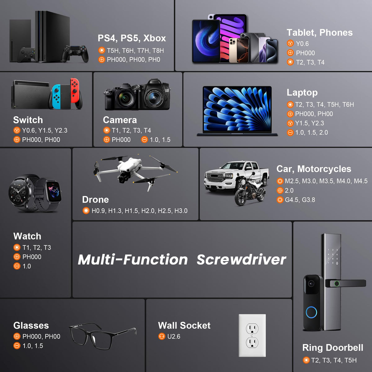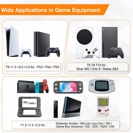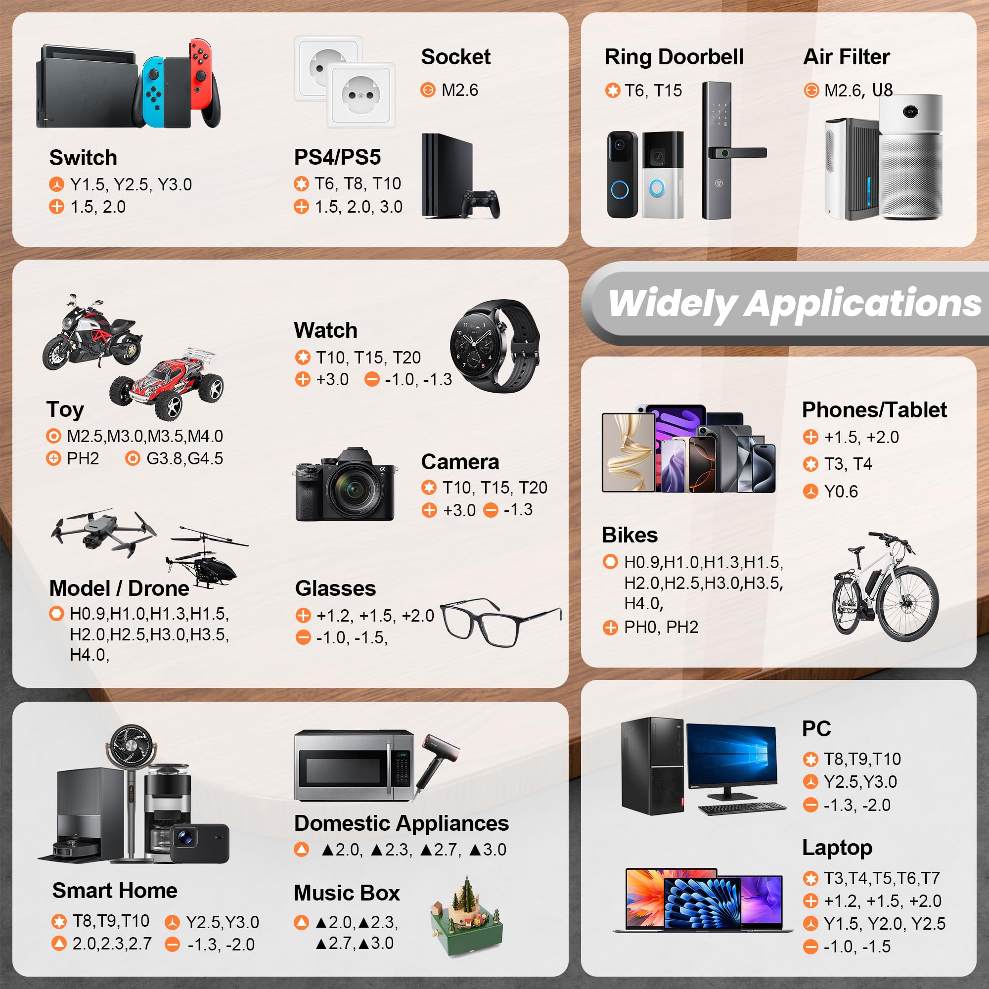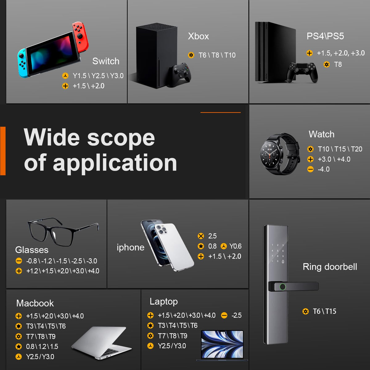 - 【Wide scope of application】-- T8 +1.5/2.0/3.0 are used for PS3/PS4/PS5 controllers and consoles. T6/8/10 are used for Xbox 360/Xbox One/Xbox Series controllers and consoles. Y1.5/2.5/3.0 +1.5/2.0 are used for Switch/NS-Lite/Joy-Con/Wii/Game Boy Advance. T3/8 are used for Fitbit wristband/folding knife. +1.2/1.5/2.0/3.0/4.0 T3/4/5/6/7/8/9 Y2.5/3.0 -2.5 are used for Microsoft/Acer/Dell and other laptops. +1.2/1.5/2.0/3.0/4.0 -0.8/1.2/1.5/2.5/3.0 are used for Desktop Computer/Watch/Glasses/Toy.