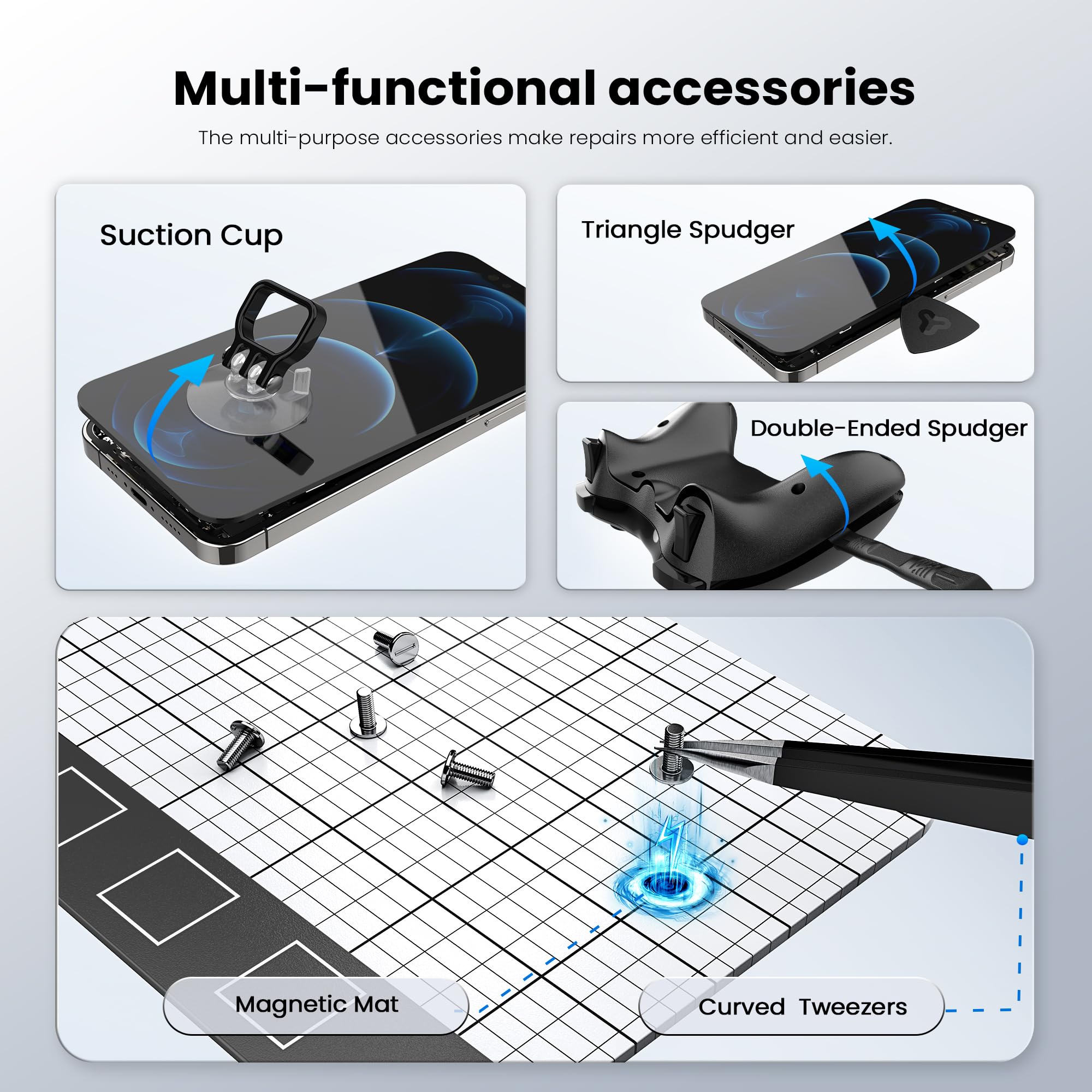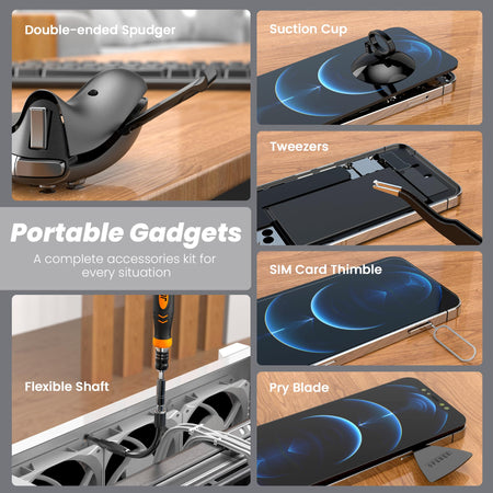 - 【Portable gadgets】-- The triangular spudger is more suitable for opening the screen of the mobile phone.The double-ended spudger is more suitable for opening the back cover of game devices. The long spudger can pry the internal parts of the device.The suction cup can open the screen, which is more convenient to repair the mobile phone.The SIM card thimble can be used to replace the SIM card of the mobile phone. The cleaning brush can clean the dust of the device.Tweezers can grip small parts.