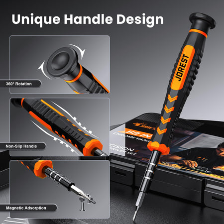 - 【Slip-resistant rotatable handle】-- All our screwdriver bits are made of high quality CR-V chrome vanadium steel. CR-V screwdriver bits do not rust easily and are not prone to be broken. The screwdriver handle is made of TPR and PP materials, with a special non-slip design, offering a sense of comfortable. The top of the handle is rotatable design which makes it more convenient to remove the screws; the handle head and the screw head has magnetic adsorption which can quickly replace the screws.