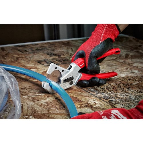 The MILWAUKEE Tubing Cutter offers straighter, cleaner cuts. It features a replaceable V-shaped, double ground steel blade for clean perpendicular cuts and maximum tool life. The one-handed locking mechanism is designed for an easy-to-use lock for improved tool safety. This PEX tubing cutter has an all-metal core for added durability on the jobsite. The Tubing Cutter has a 1'' capacity for rubber, plastic, and PEX Tubing. It is for use with the Milwaukee Tubing Cutter Blade (Sold Separately, 48-22-4203). The tubing cutter tool is backed by Milwaukee's Limited Lifetime Warranty. Straighter, Cleaner Cuts Double Ground V-Shaped Blade for Clean Cuts Easy One-Handed Locking Mechanism All Metal Core Double Ground V-Shaped Blade - For cleaner cuts on 1in. Tubing (Patent Pending)