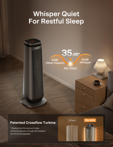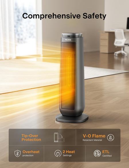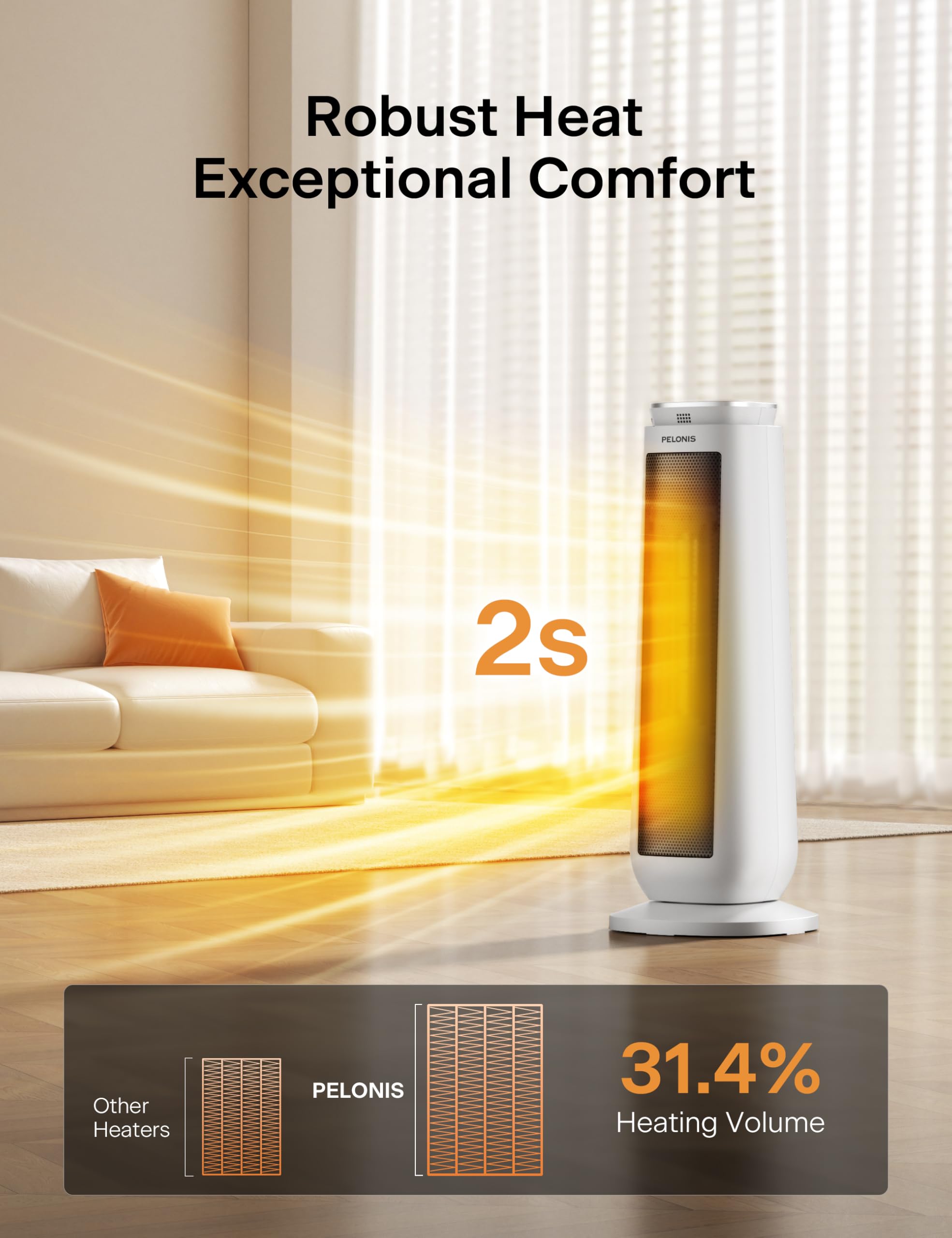 More Durable and Reliable Warmth from PELONIS PTC Tower Heater PTC ceramic heater deliver instant and directional warmth. Ideal for small to medium room, it heats up fast and delivers wide range of heating air supply. The PELONIS innovative and ultra-wide PTC energy-saving heating element can give out heat in large area., and with the ultra-high heat efficiency, it can improve the indoor temperature in a short time. More features of the Pelonis PTC Tower.