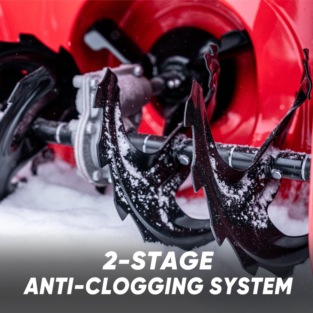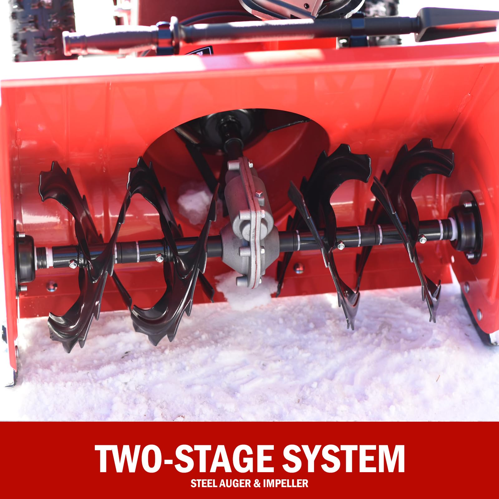 - Two-stage system: Uses an all-steel auger to break up icy snow and a high-speed impeller to eject it from the chute for fast snow removal.