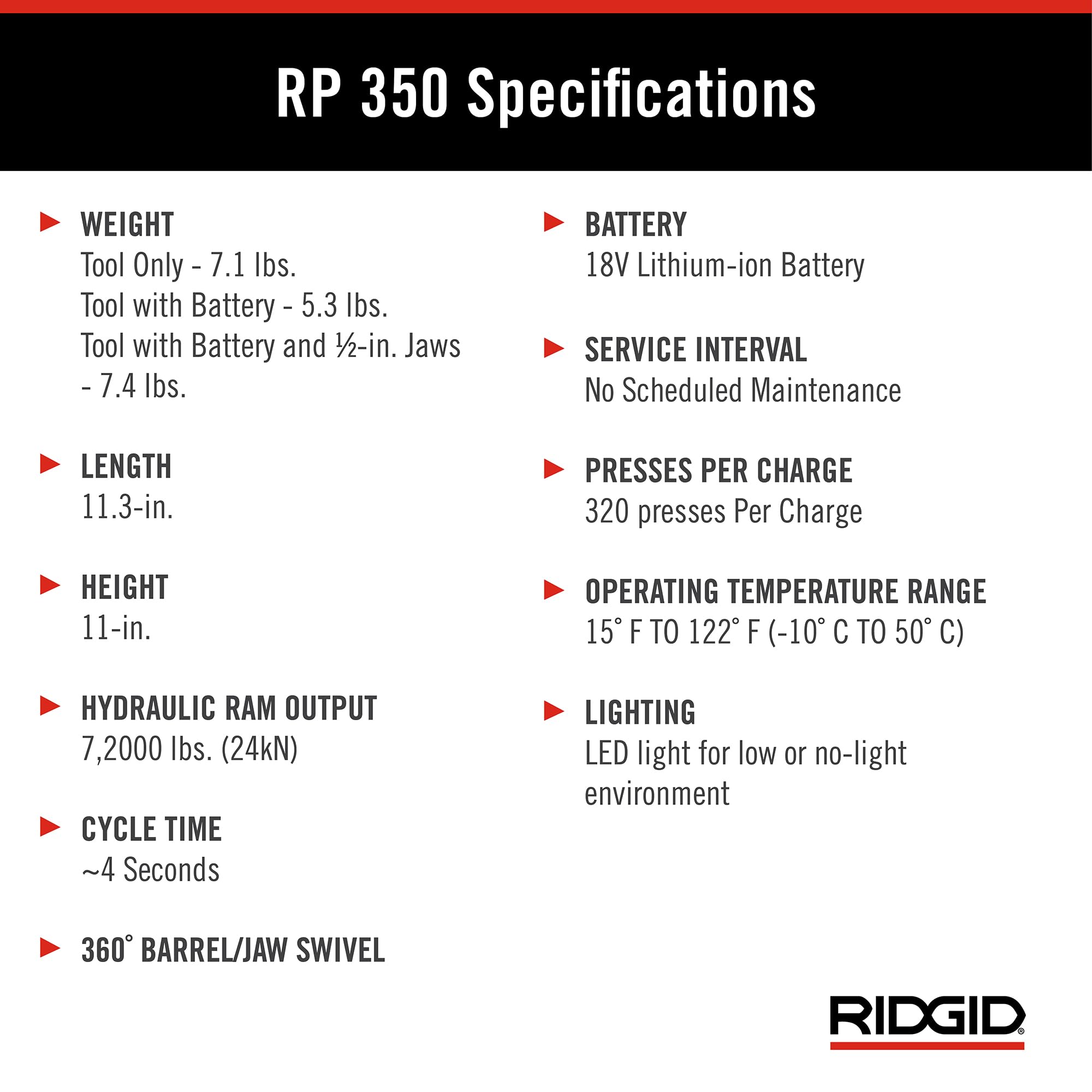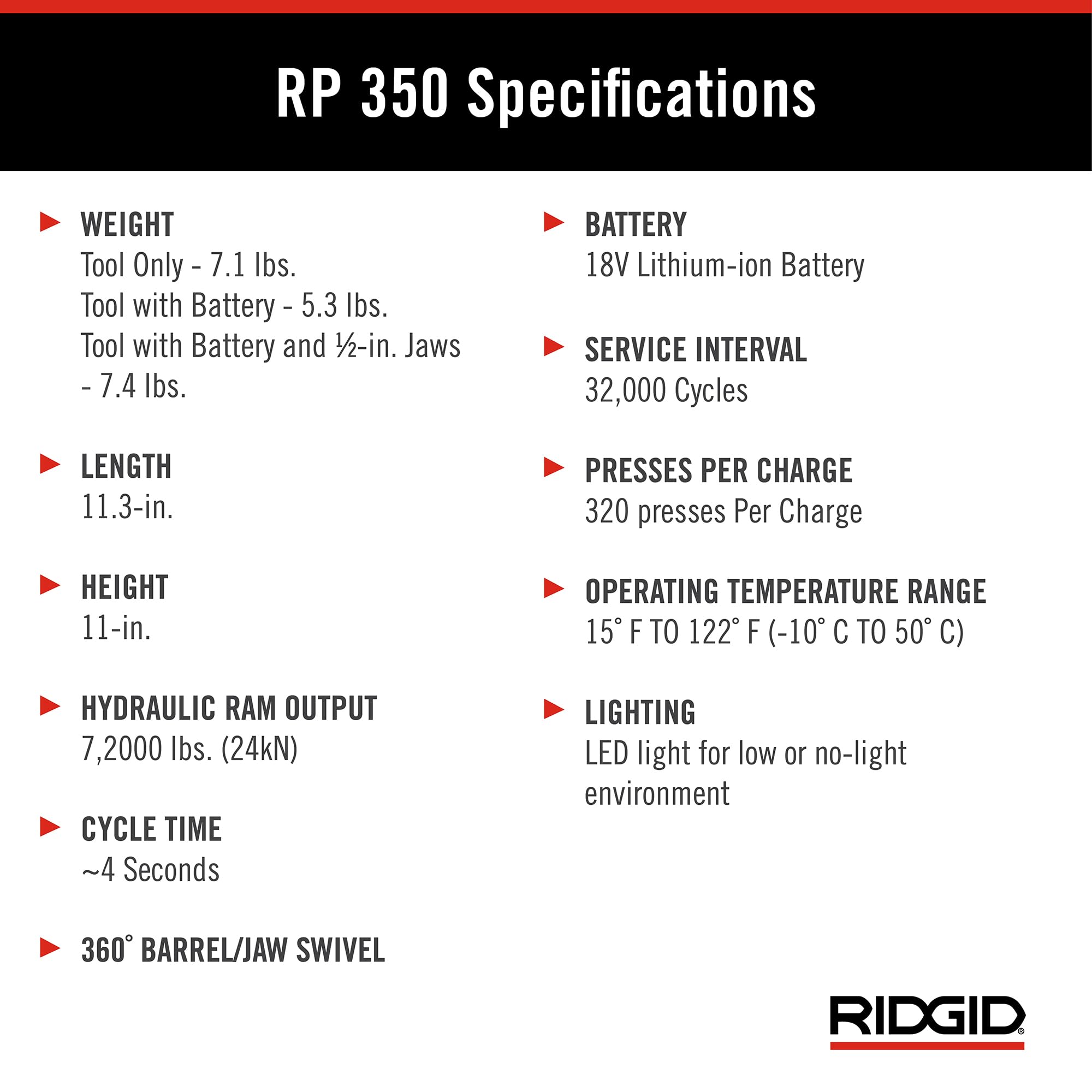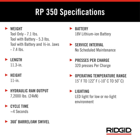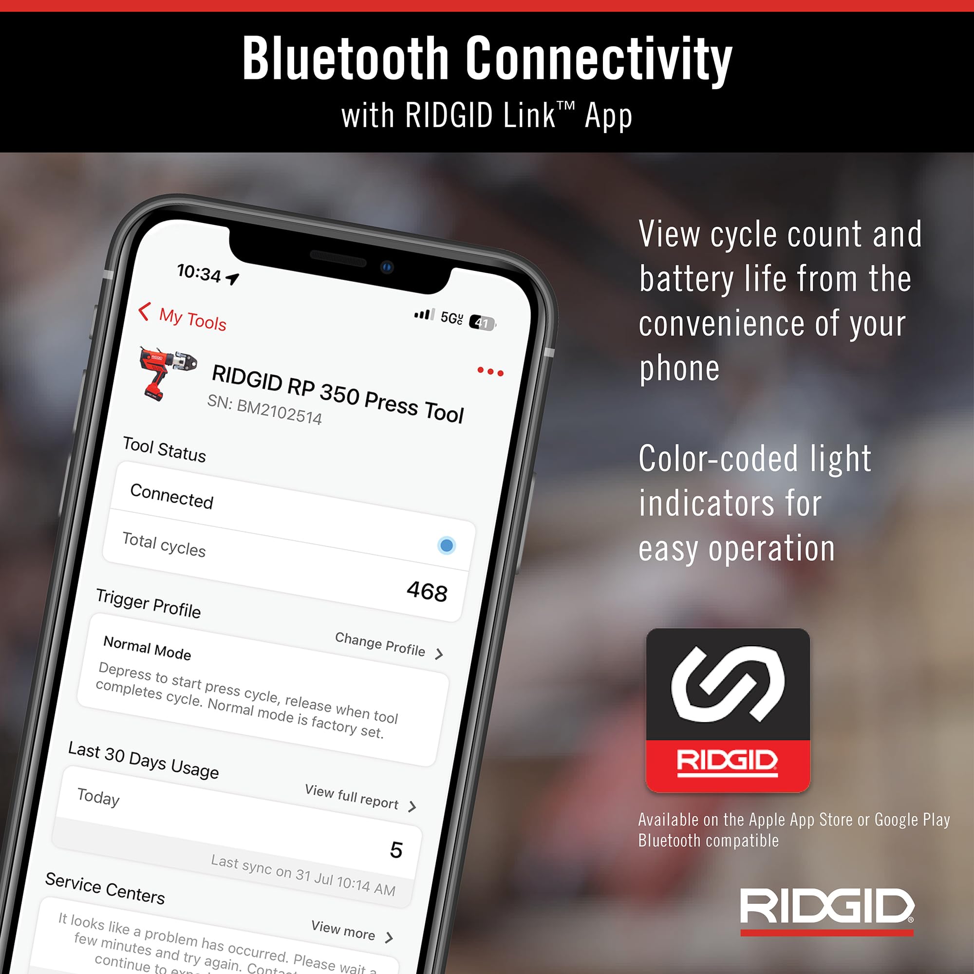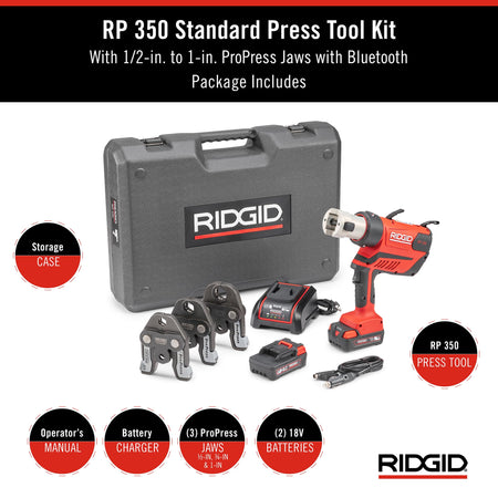 Master your jobs with ease and accuracy with the RIDGID Model RP 350 ProPress Press Tool (catalog number 67053, model RP 350). Designed for plumbing experts, this press tool is the only press tool compatible with all RIDGID Standard Series jaws, rings, actuators, and attachments. The durable, brushless motor is capable of performing over 100,000 press cycles for a long tool life, and the press tool requires no scheduled maintenance. Featuring an agile 360-degree head swivel, the press tool offers superior flexibility in tight spaces. It's made with the most advanced LED interface and bright, robust lighting for convenience when working in low-light areas on the jobsite. Designed for maximum performance, the press tool features Bluetooth connectivity and easy color-coded light indicators to make operation simple. This press tool kit includes the RIDGID RP 350 ProPress Press Tool, 4 ProPress Jaws (1/2" to 2"), an 18-volt battery, charger, and a rugged carrying case. RIDGID is a global manufacturer trusted by the skilled trades in more than 100 countries. BUILT FOR THOSE WHO KNOW.®.