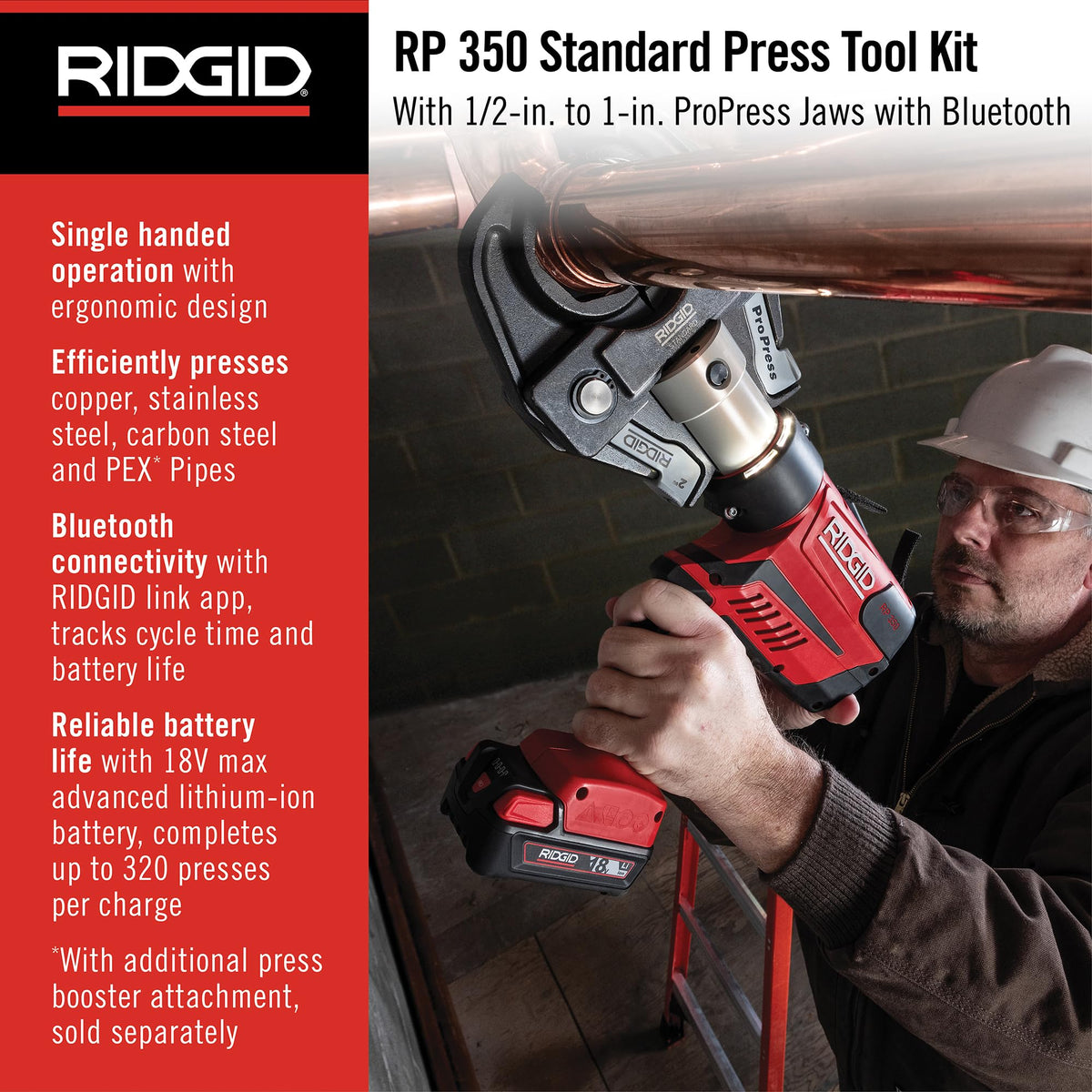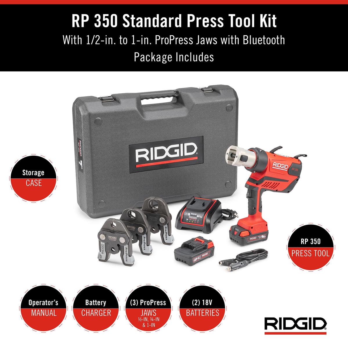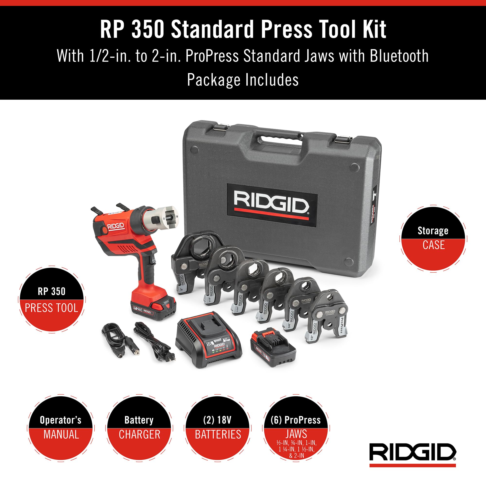 RIDGID 67053 RP 350 ProPress 8-Piece Pressing Tool Kit with 18-Volt Battery, Charger, 4 ProPress Press Tool Jaws (1/2" to 2"), and Case