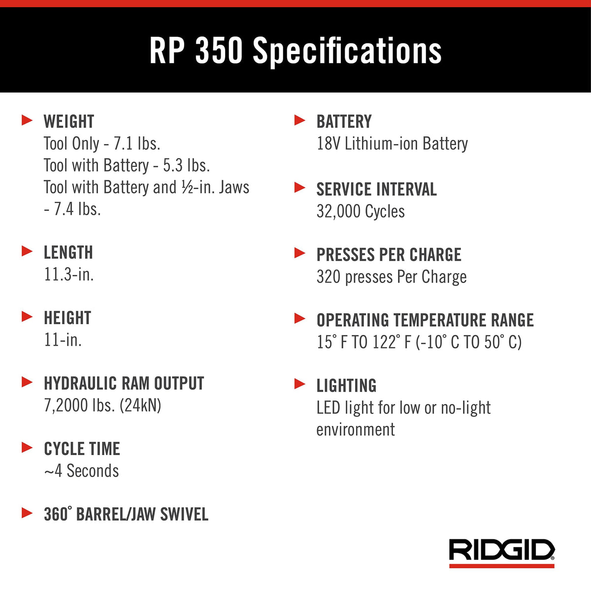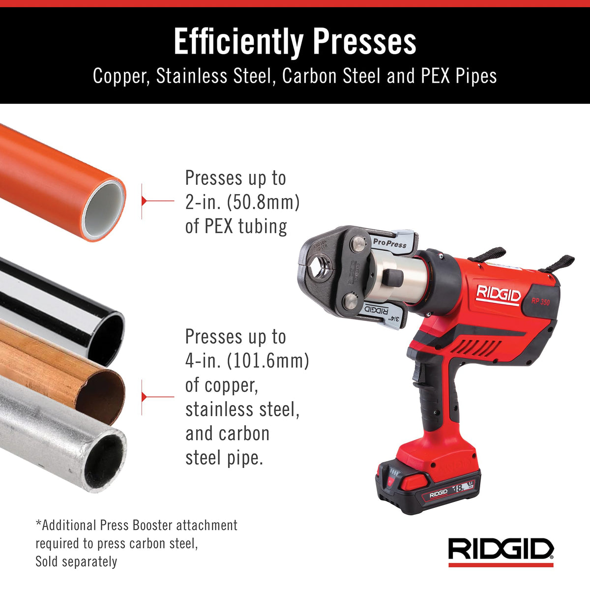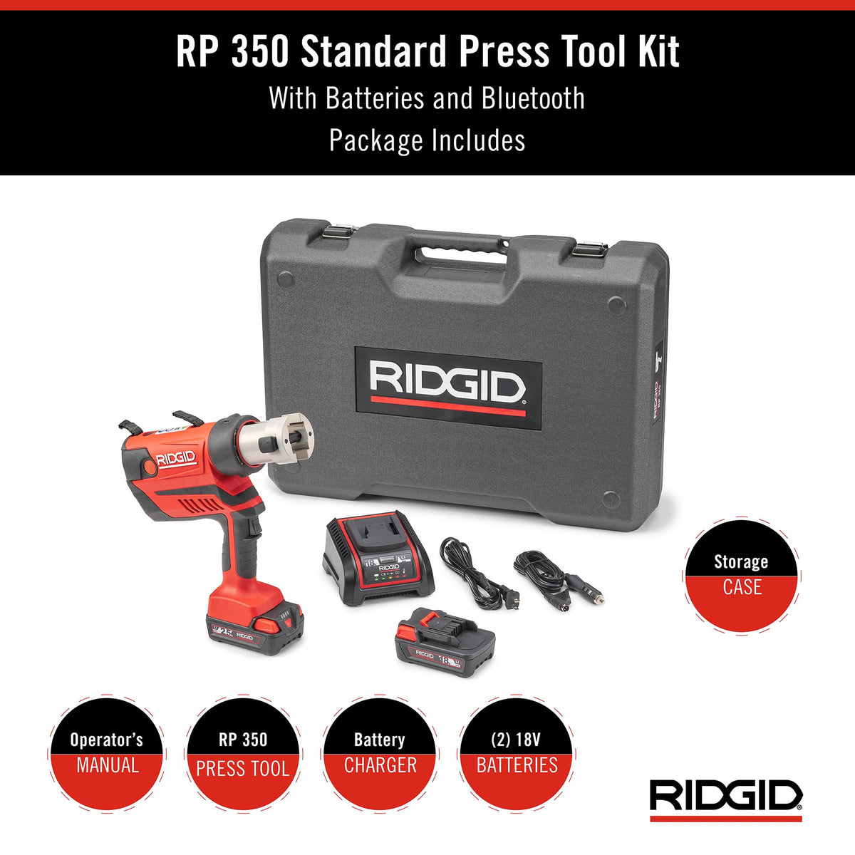 RIDGID 67053 RP 350 ProPress 8-Piece Pressing Tool Kit with 18-Volt Battery, Charger, 4 ProPress Press Tool Jaws (1/2" to 2"), and Case