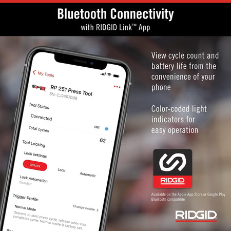 - BLUETOOTH CONNECTIVITY: Download the free RIDGID Link app and connect the press tool to your mobile device via Bluetooth to access tool information like amount of press cycles, tool locking, service interval, battery status, and more