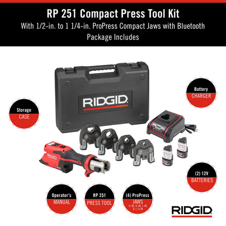 RIDGID 78148 RP 251 Compact Press Tool Battery Kit with ProPress Jaws (1/2" to 1-1/4"), In-Line Pressing Tool for Copper, Stainless Steel, PEX, and Carbon Steel