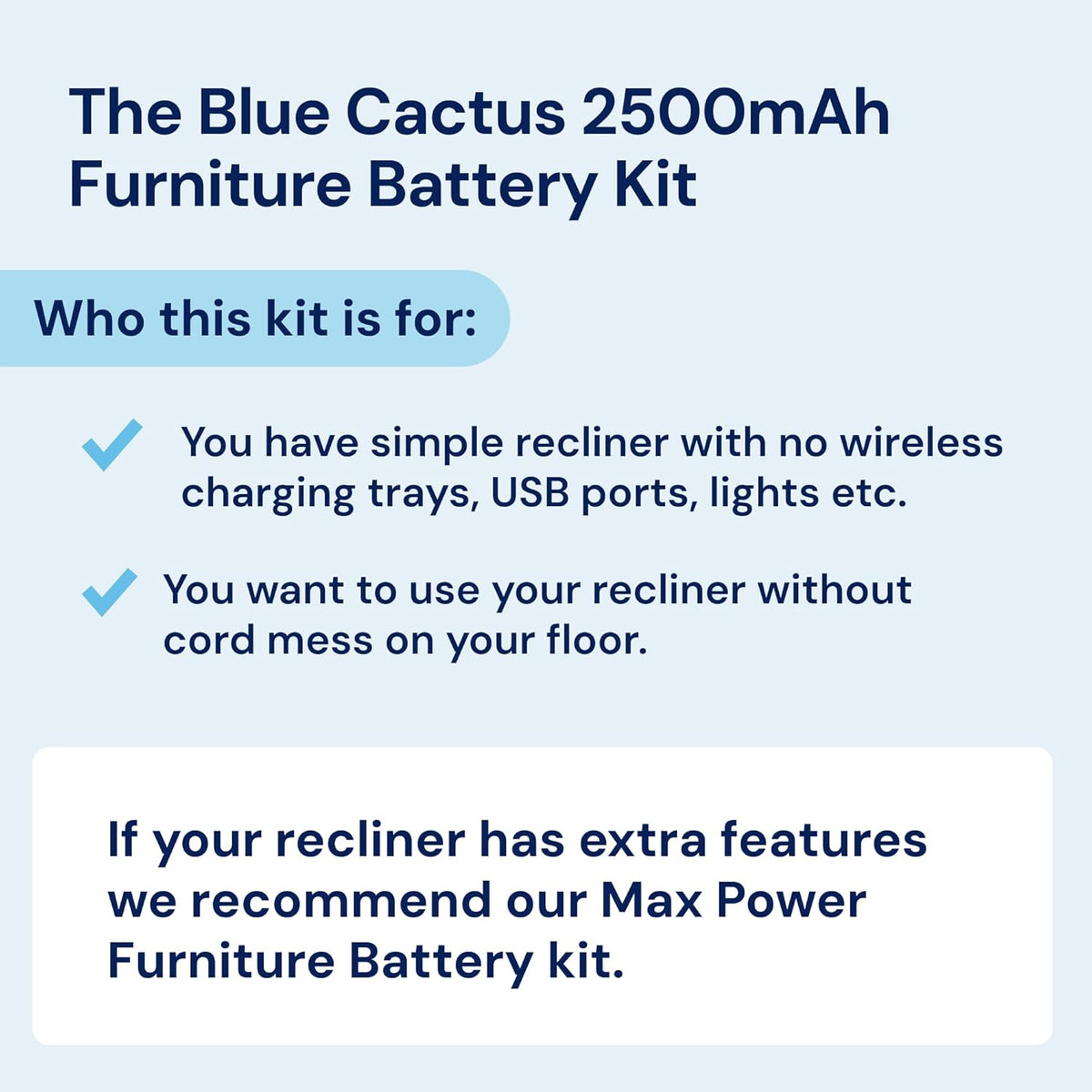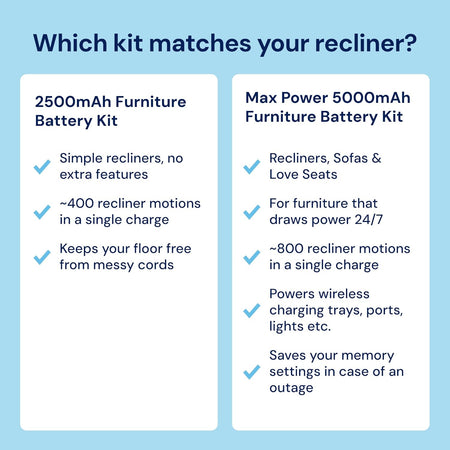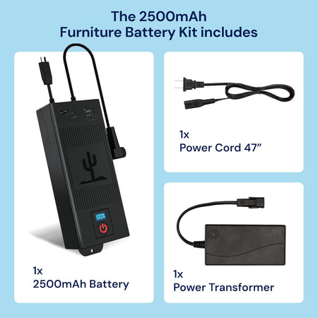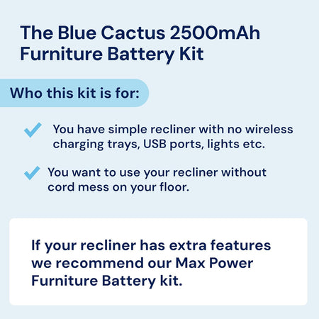 - Complete Kit Details: The Blue Cactus Company Battery Pack for Reclining Furniture includes a 2500 mAh battery pack, offering a dependable power recliner battery pack. Please note that the charger and power cord are not part of this package