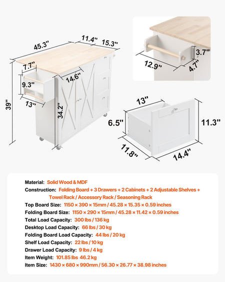 - Quality & Durability: Our kitchen island’s drop leaf uses high-quality solid rubber wood, and it has a frame made of durable MDF, which makes it long-lasting for years to come. The top features are anti-dirt and waterproof.