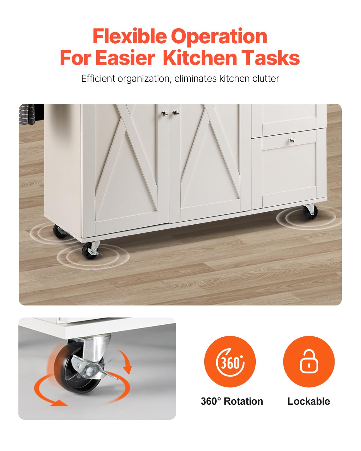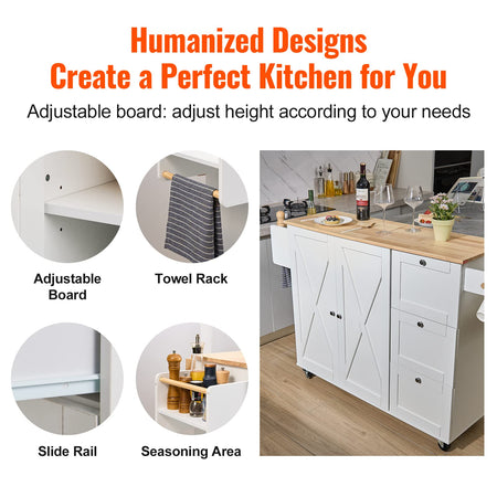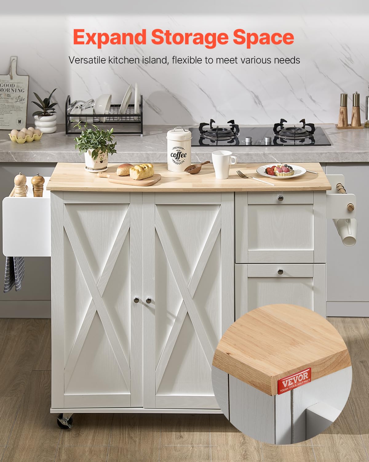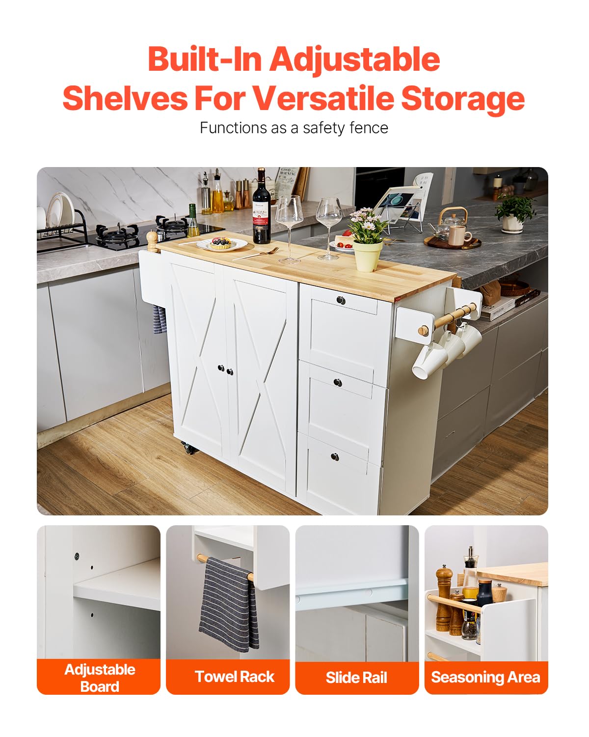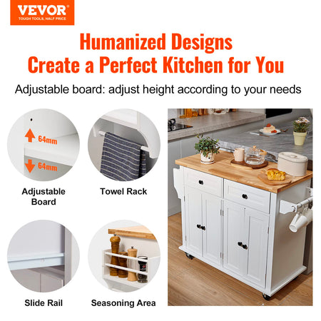 VEVOR Kitchen Island Cart with Solid Wood Top, 35.4" Width Mobile Carts with Storage Cabinet, Rolling Kitchen Table with Spice Rack, Towel Rack, and Drawer, Portable Islands on Wheels, White