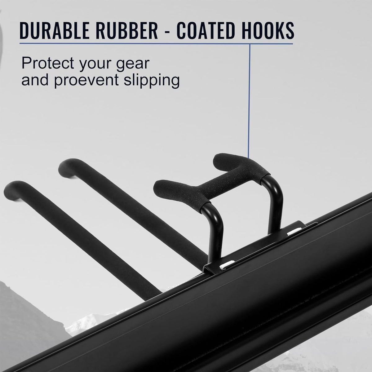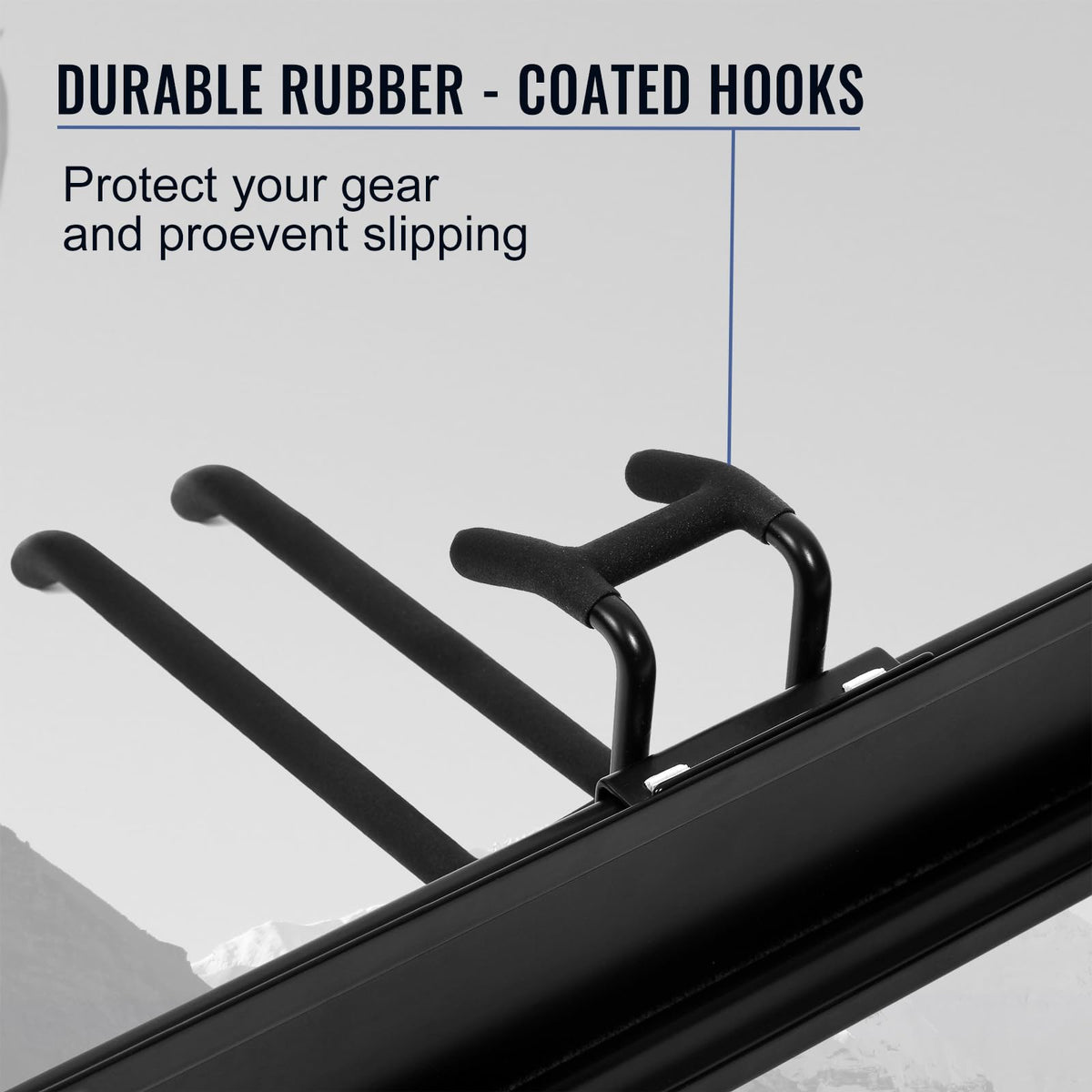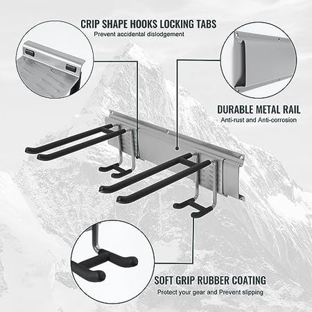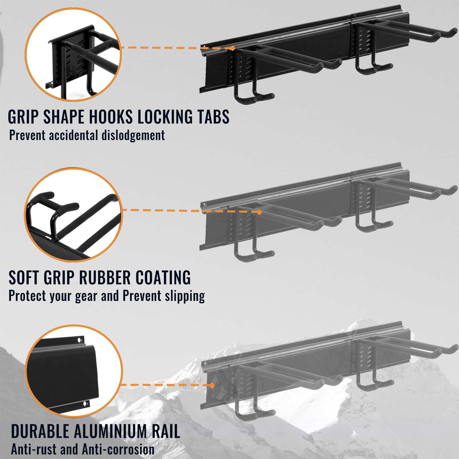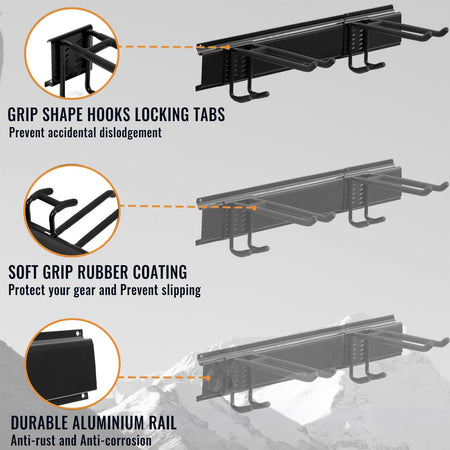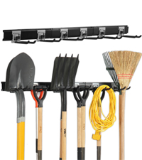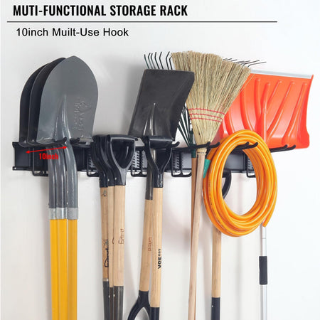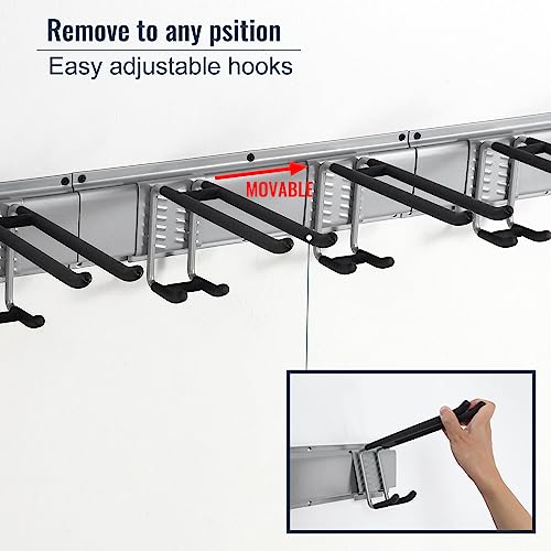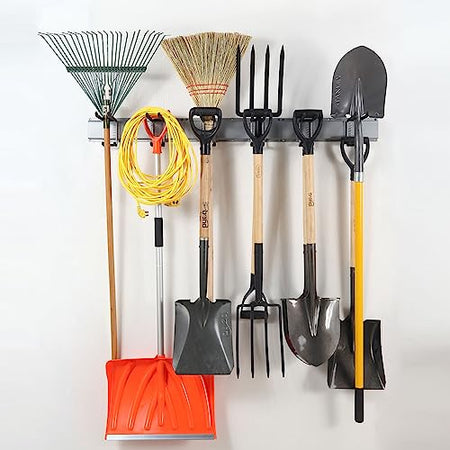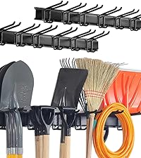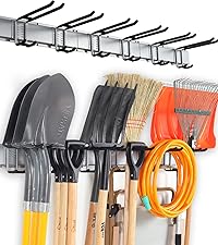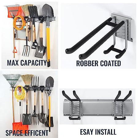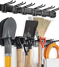 - DURABLE RAILS & RUBBER-COATED HOOKS: This garden tool organizer has 6 hooks, each 10 inches long. The hooks are wrapped in rubber to protect your tools from sliding and getting damaged. Rubber-coated sleeves prevent your tools from getting scratched or slipping.