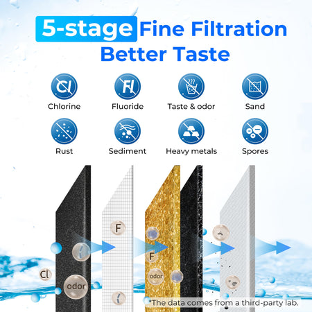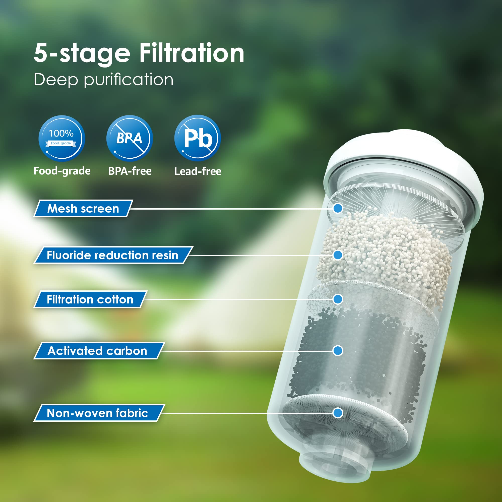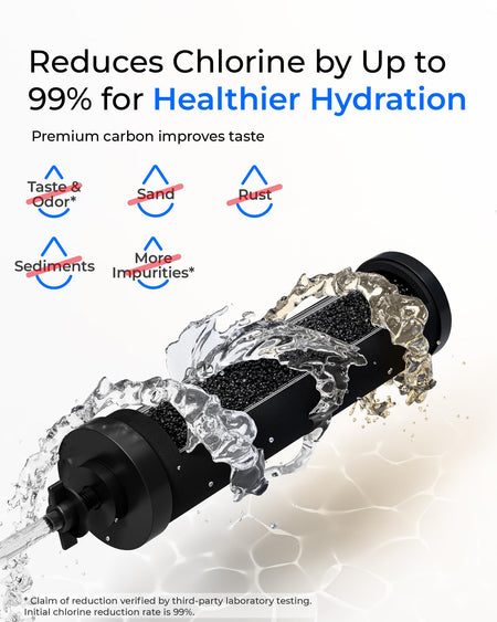 - Efficient filtration: Developed for families that use substandard drinking water, for travel and outdoor activities, the Black Carbon Filters uses natural coconut shell activated carbon and BPA-free housing, which effectively reduces harmful substances such as sand, rust, odor, sediment, and large particles and improves the taste of water. You can get up to 99% of chlorine reduction. (Tested by third party laboratory.) It provides you with clean, safe water.