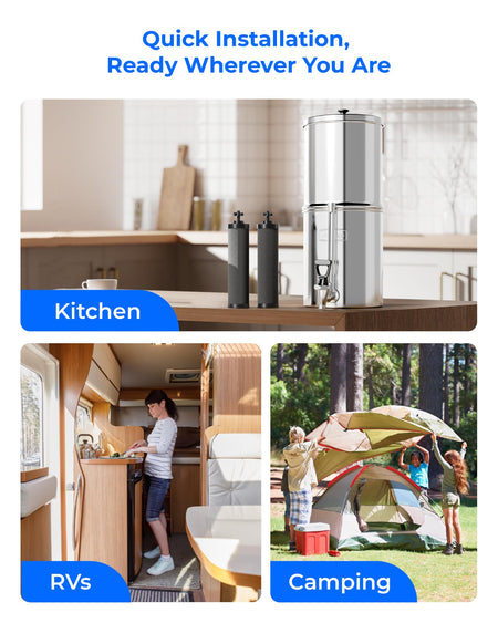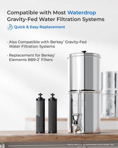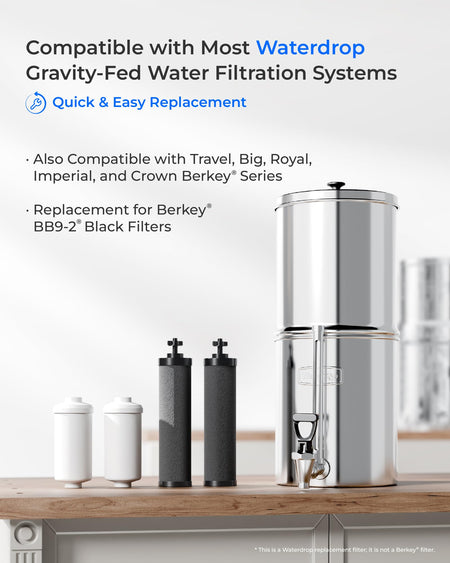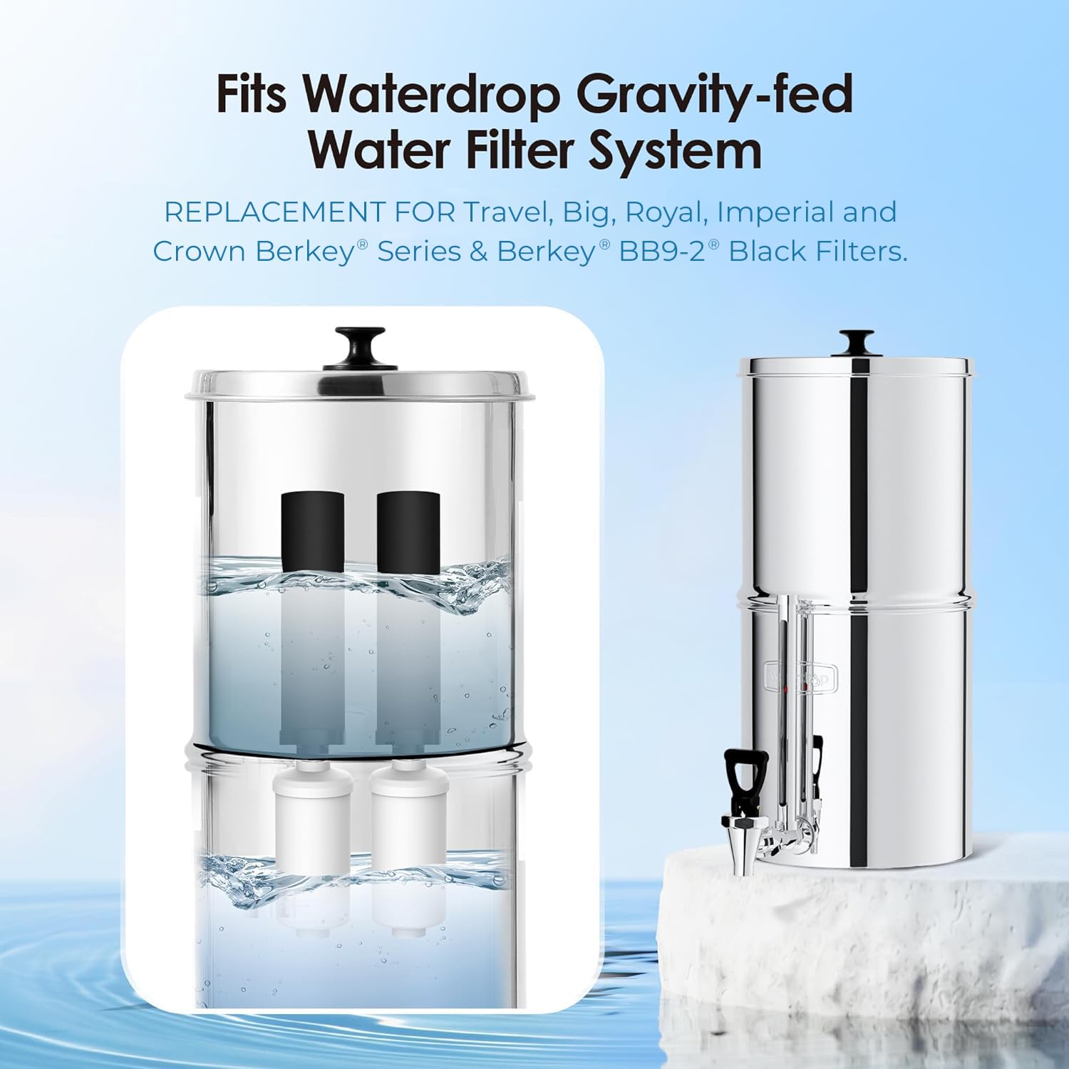 - Compatible models: The filter can be replacement for Berkey BB9-2 black filters, Travel, Big, Royal, Imperial, Light, Crown Berkey Series. And it is also compatible with Waterdrop Gravity-fed Water Filter System. The water filter is not sourced by or sponsored by Berkey. Waterdrop is an independent brand. Please flush filter for 1 min before use by connecting to faucet. Note: if faucet not fully compatible, splashing may occur but won't affect product.