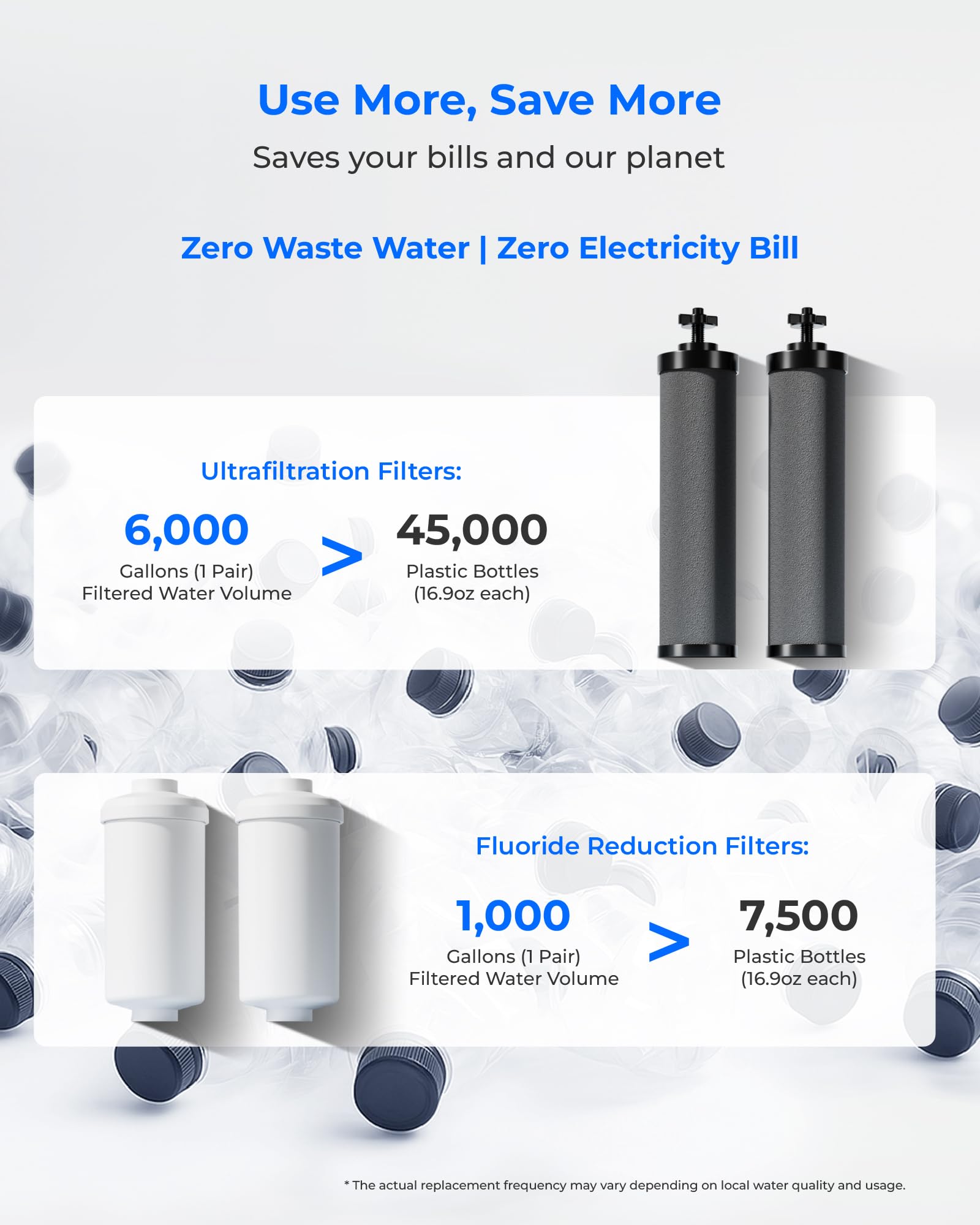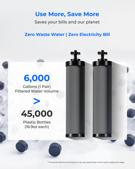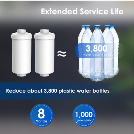 - Longer service life: The Black Carbon Filters can provide 6,000 gallons of fresh water. For better performance, we recommend that you replace the filter every 6,000 gallons per pair. However, this may vary depending on your water conditions.