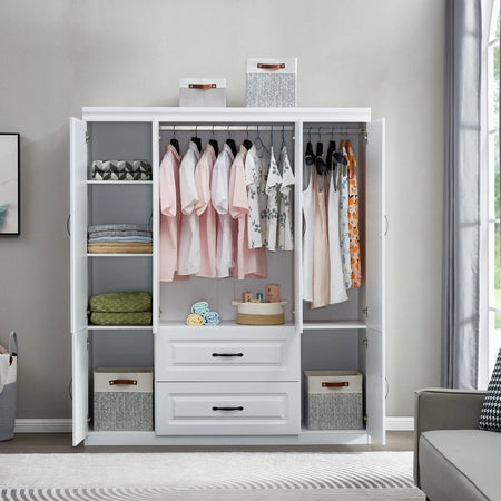 YG-15 74" H White Solid Wood Freestanding Wardrobe Closet for Clothes Storage. Bedroom Wardrobe Storage Cabinet featuring 2 Hanging Rod Shelves, 2 Drawers, and 5 Storage Compartments
